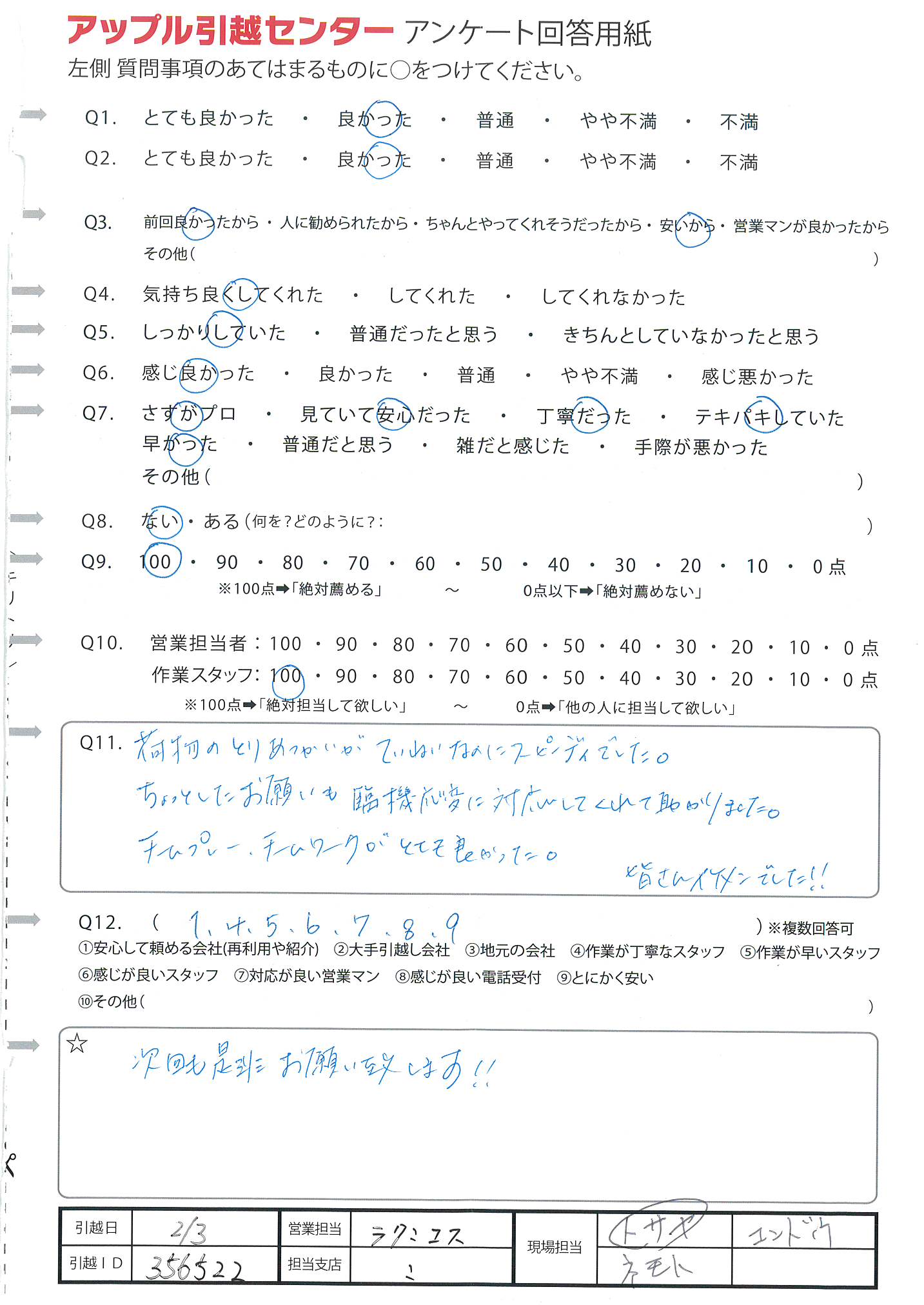 A.今までに利用した引越し屋さんの中で1番良かったと思います。また機会があればよろしくお願いします。
