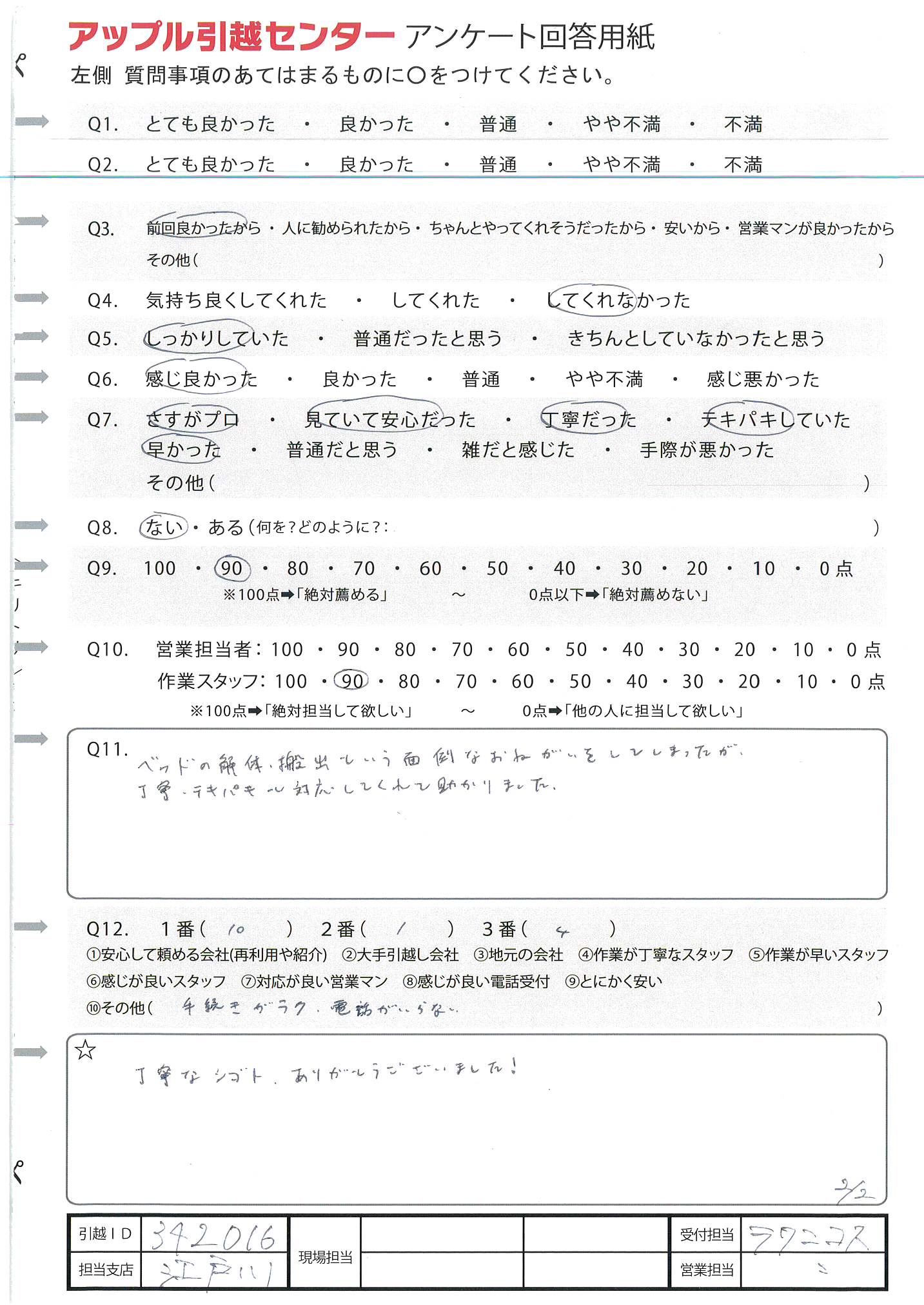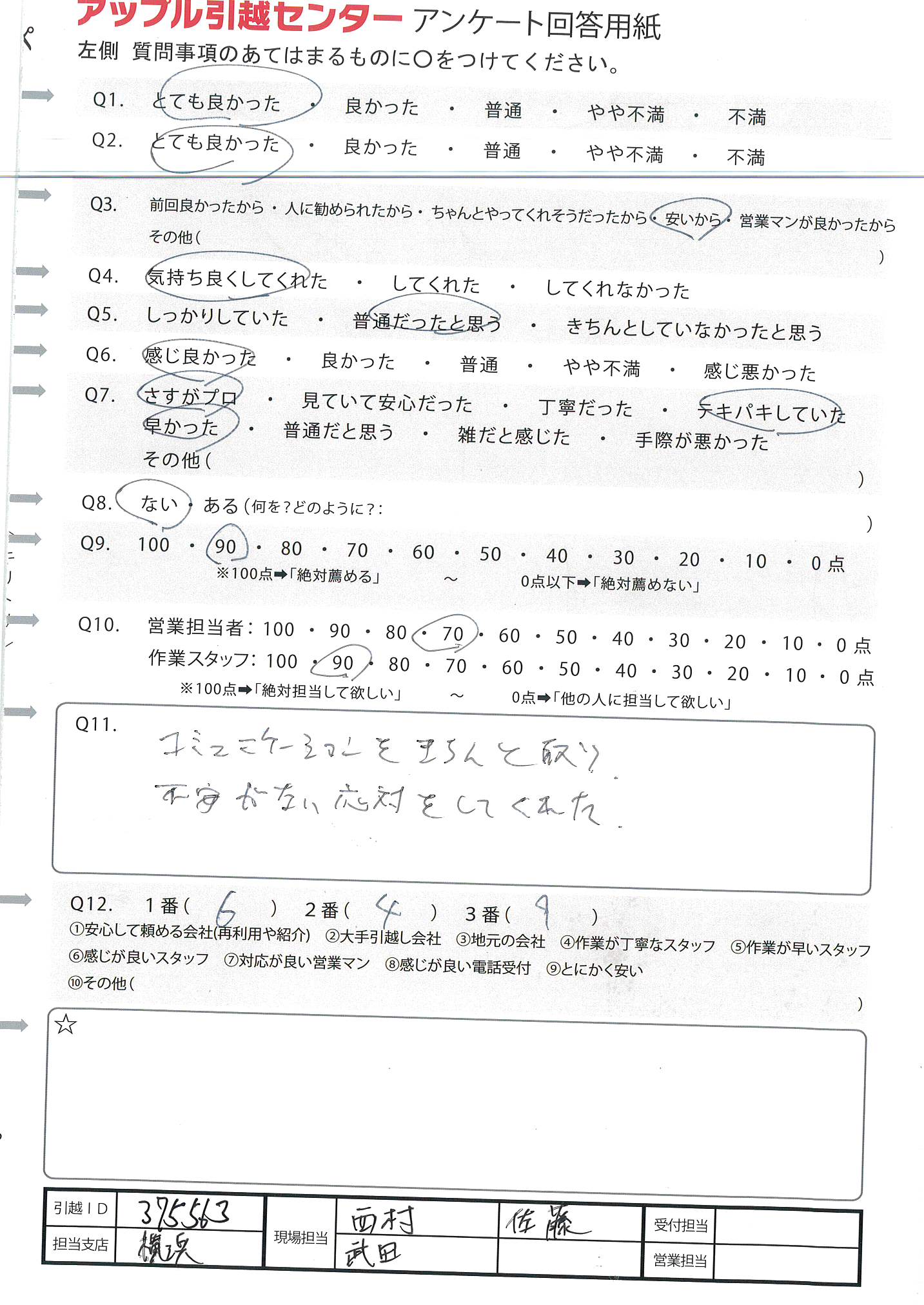 A.作業スタッフ(練馬支店土佐谷さん)が、大変機転が利き、テキパキと又、お願いしたことに対して、誠実に対応をしてくれました。 又、営業担当の西村さんの電話での対応も親切に、ていねいでした。