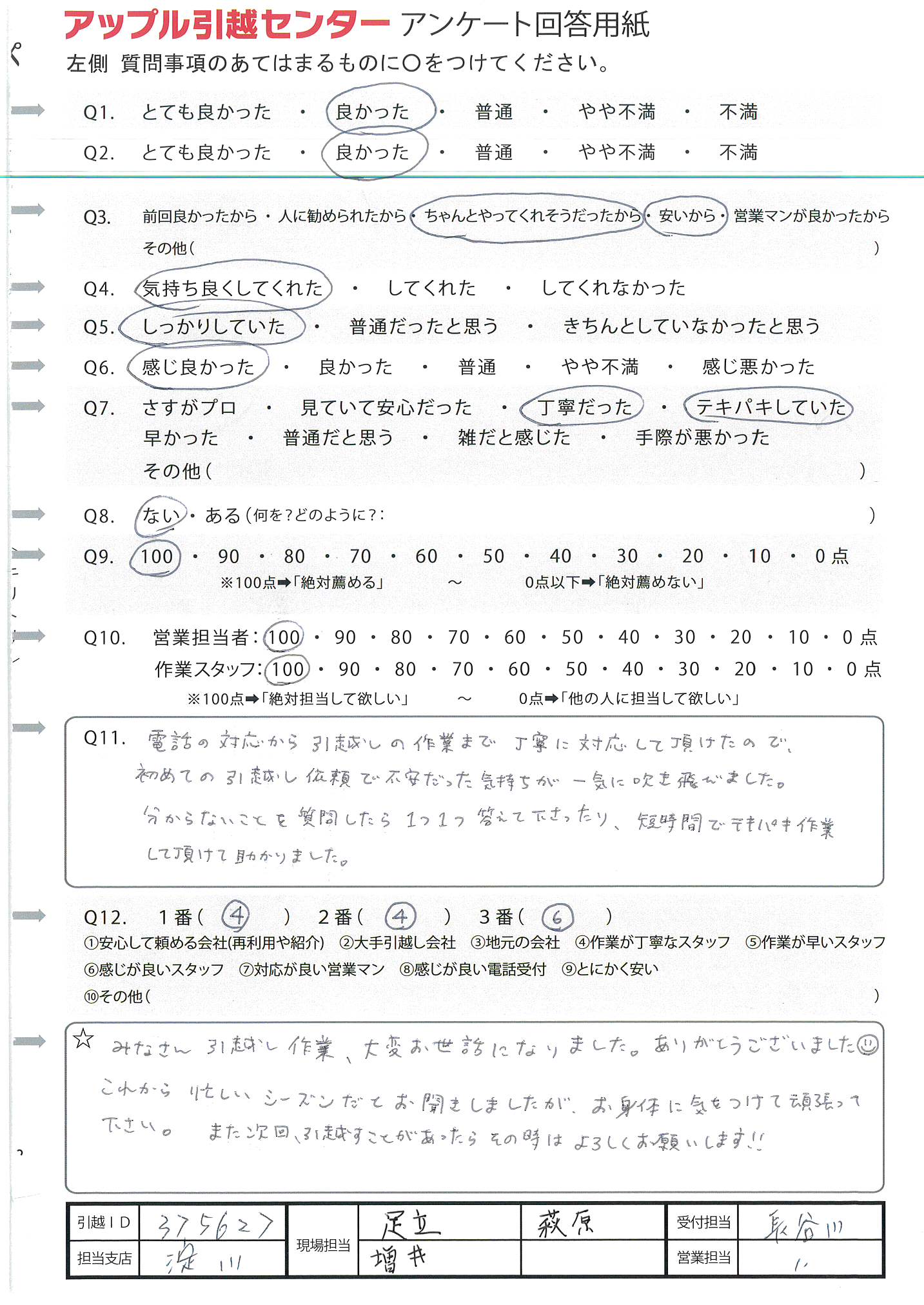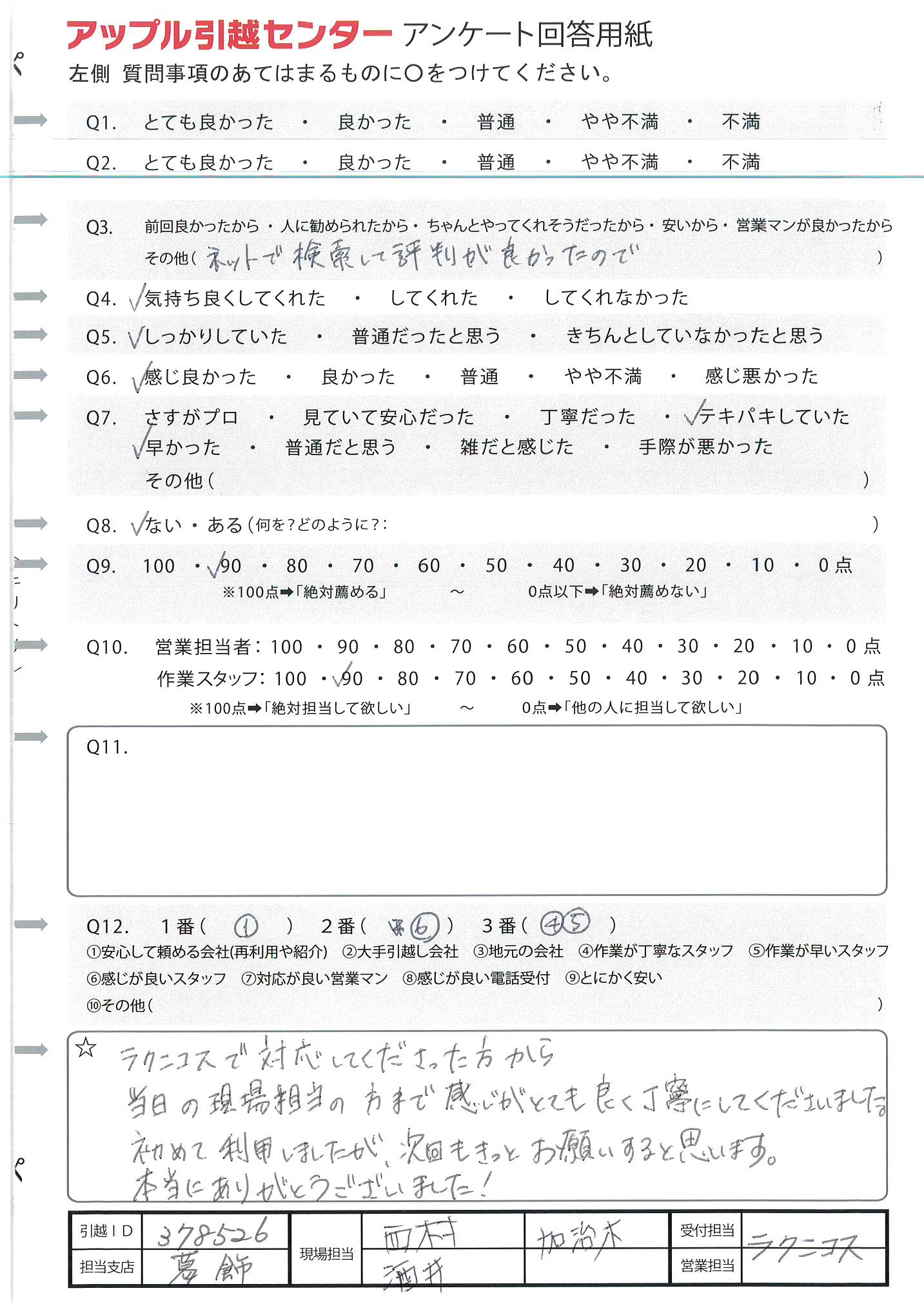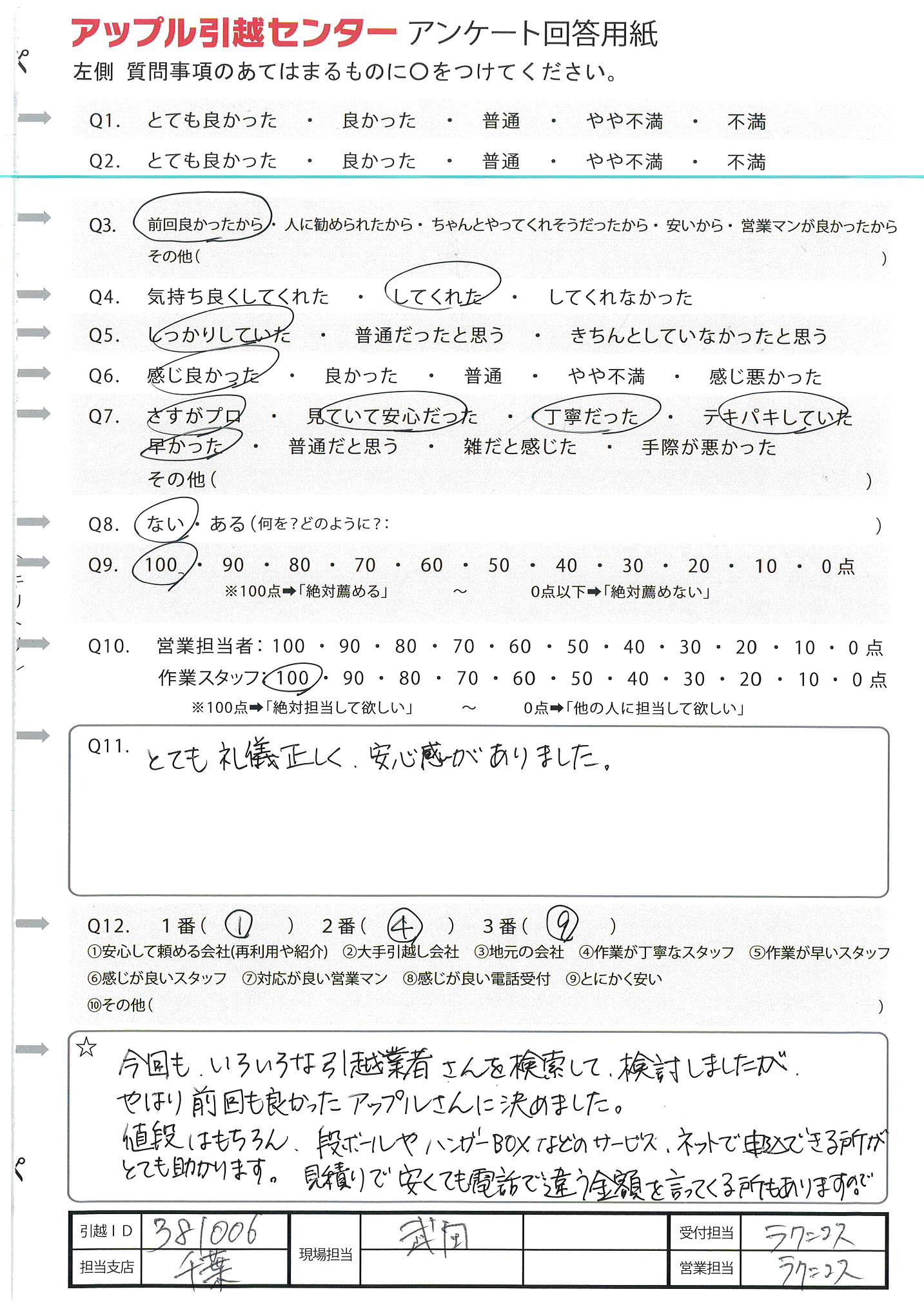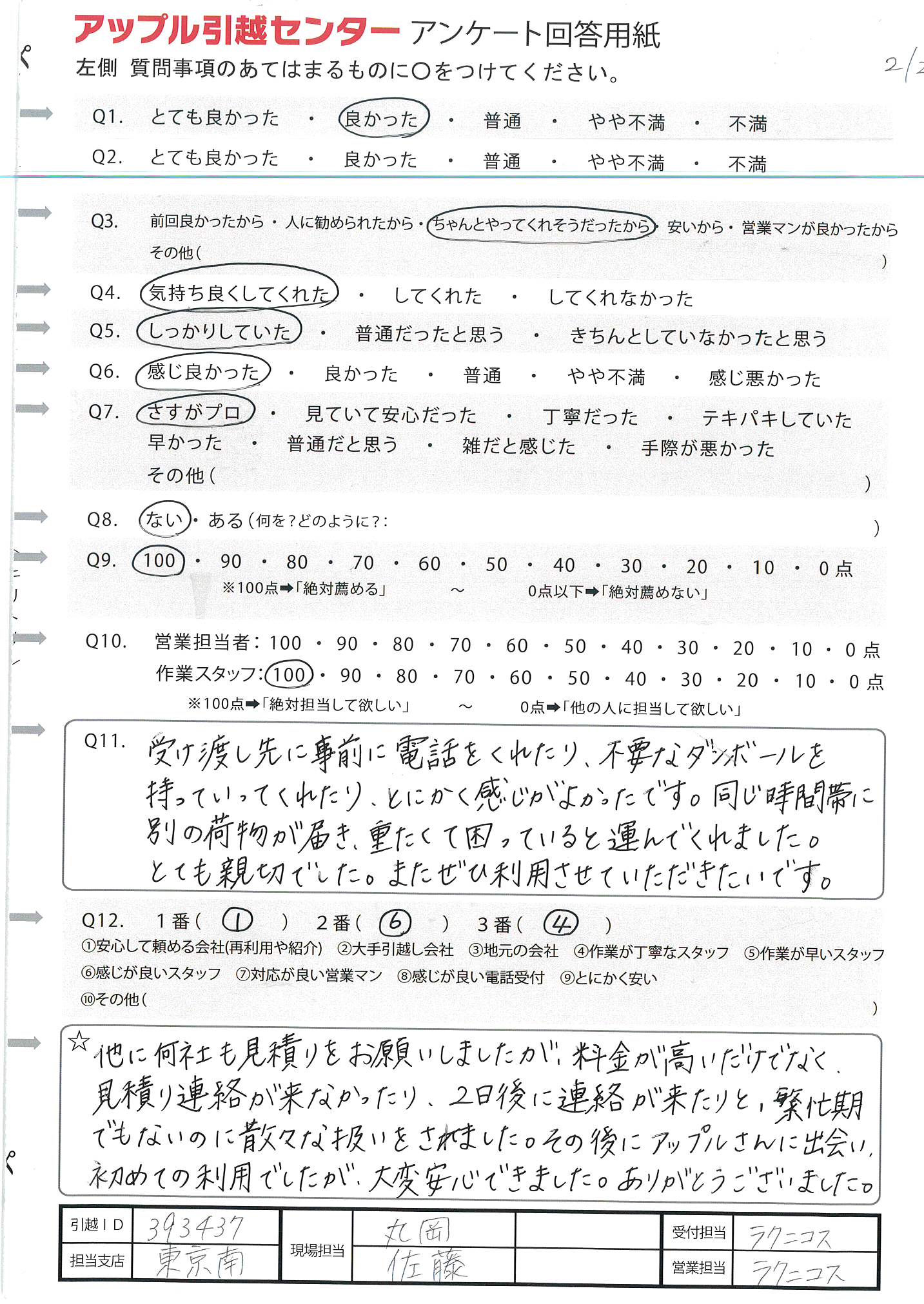 A.周りに引越ししそうな人があまりいないので、100%の可能性ではないため(Q9) 今回初めて利用及び10年振りの引越しだったため不安でしたが、対応よくしていただいたので感謝しています。