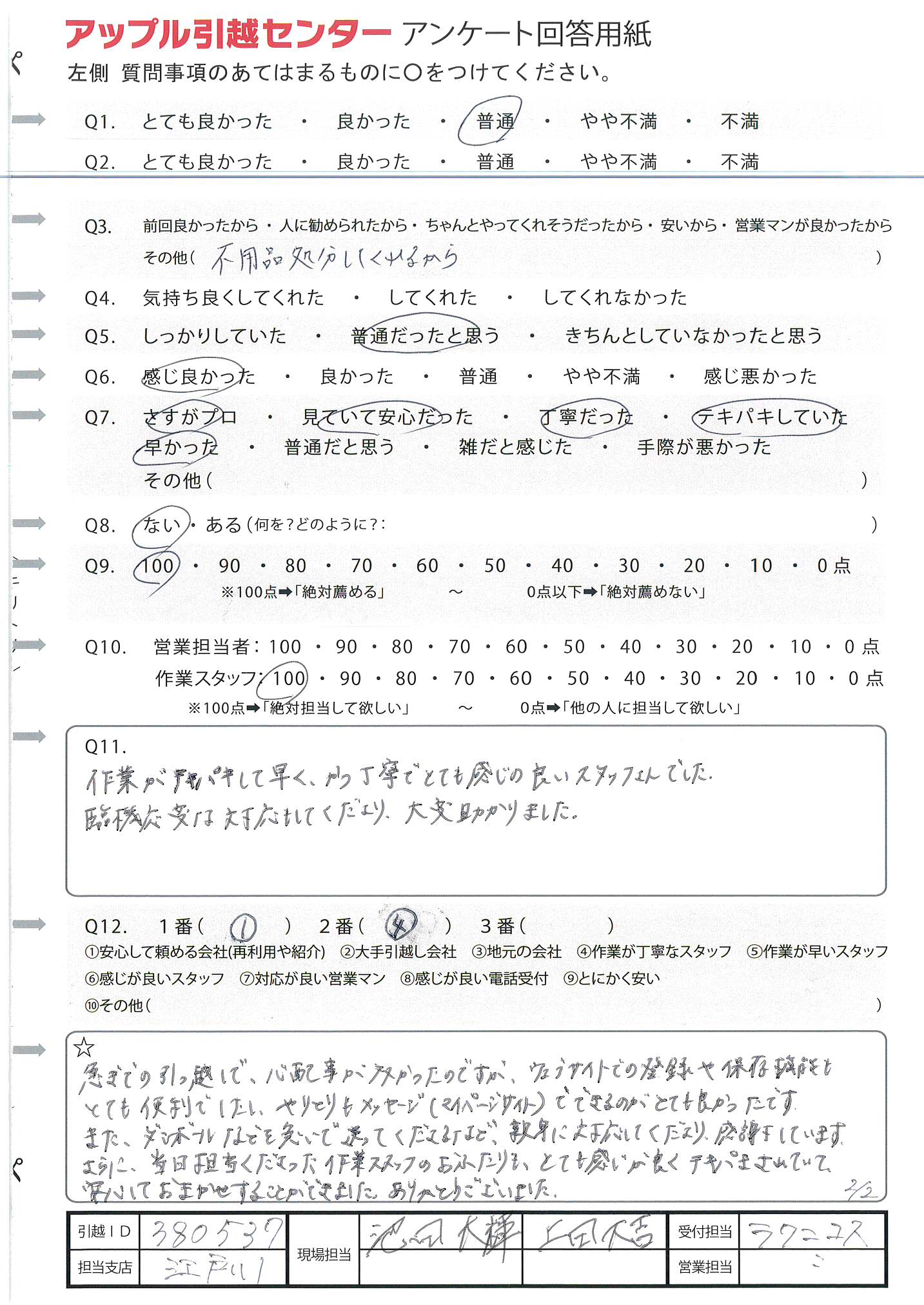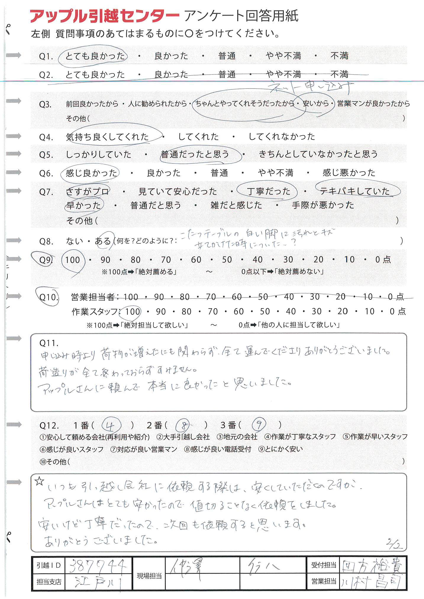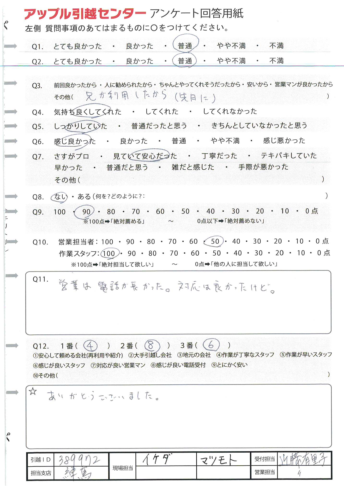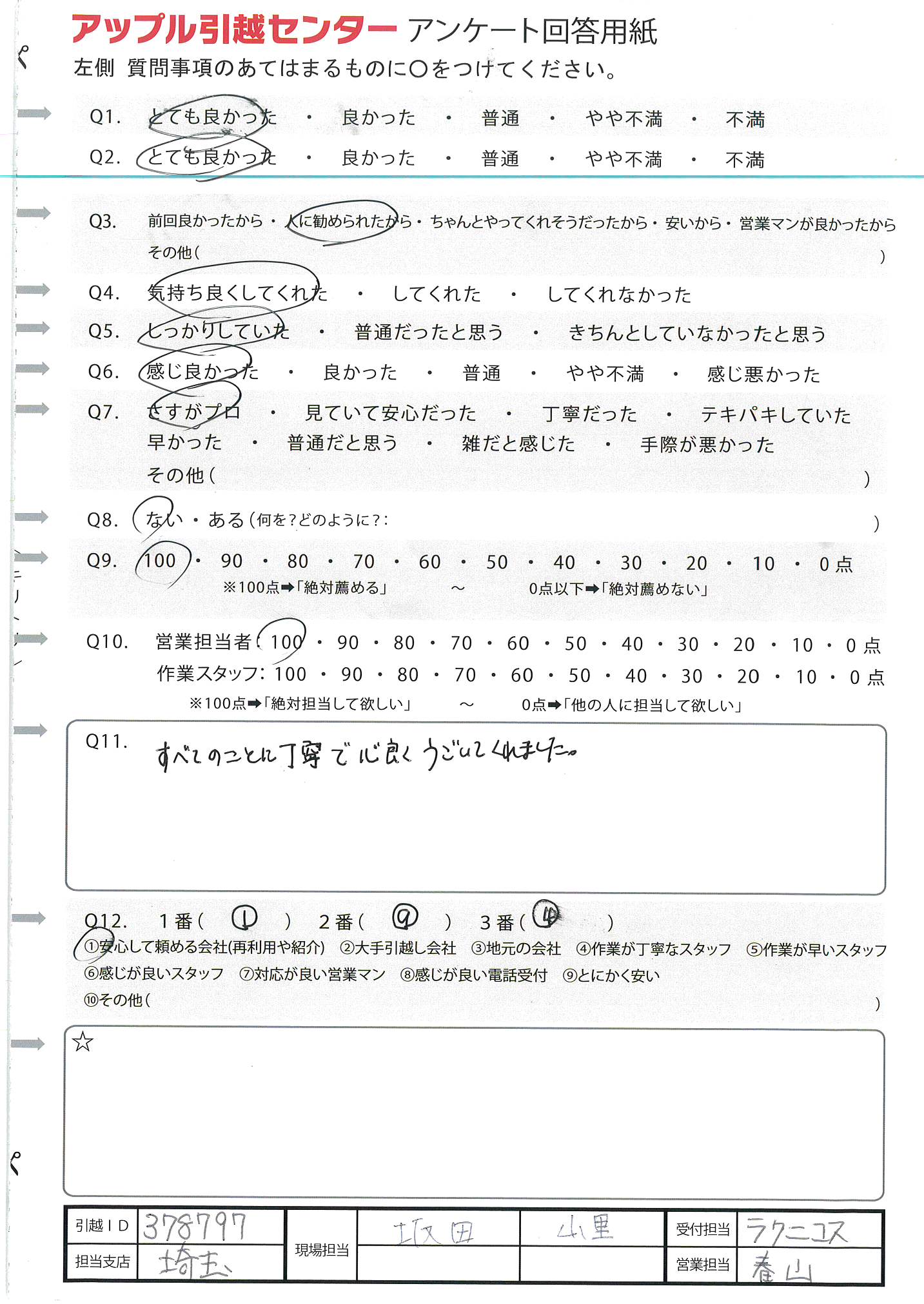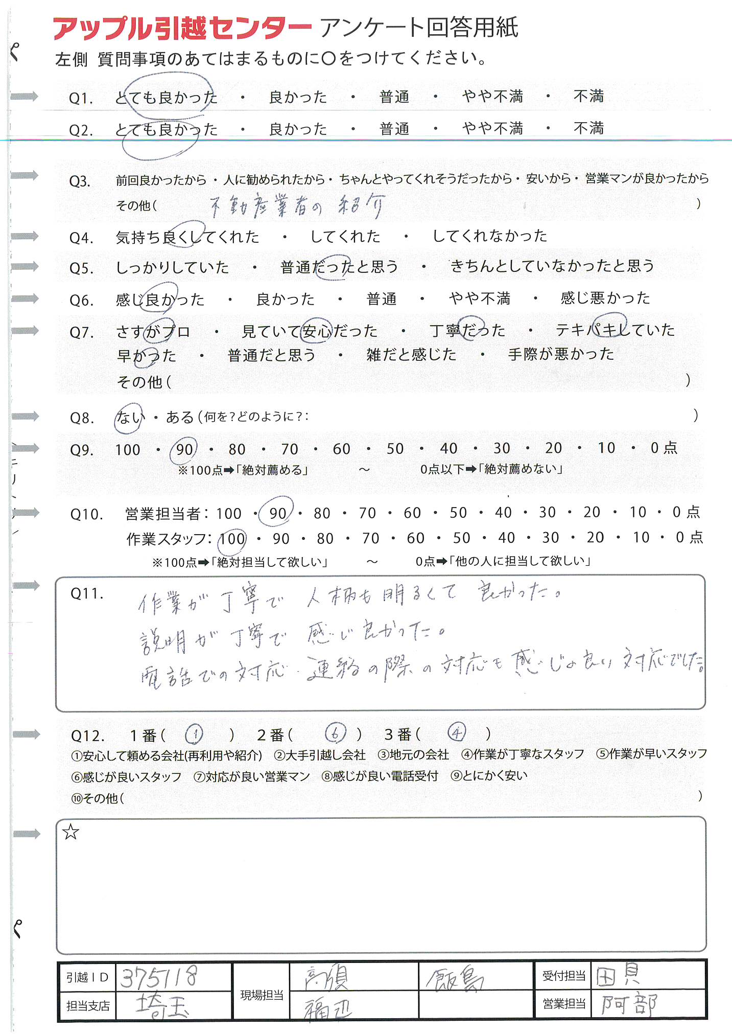 A.周りに引越ししそうな人があまりいないので、100%の可能性ではないため(Q9) 今回初めて利用及び10年振りの引越しだったため不安でしたが、対応よくしていただいたので感謝しています。