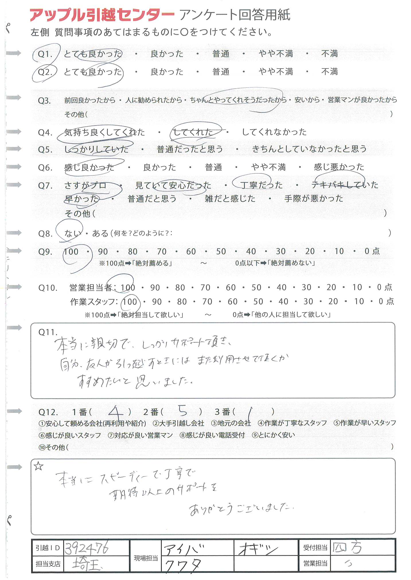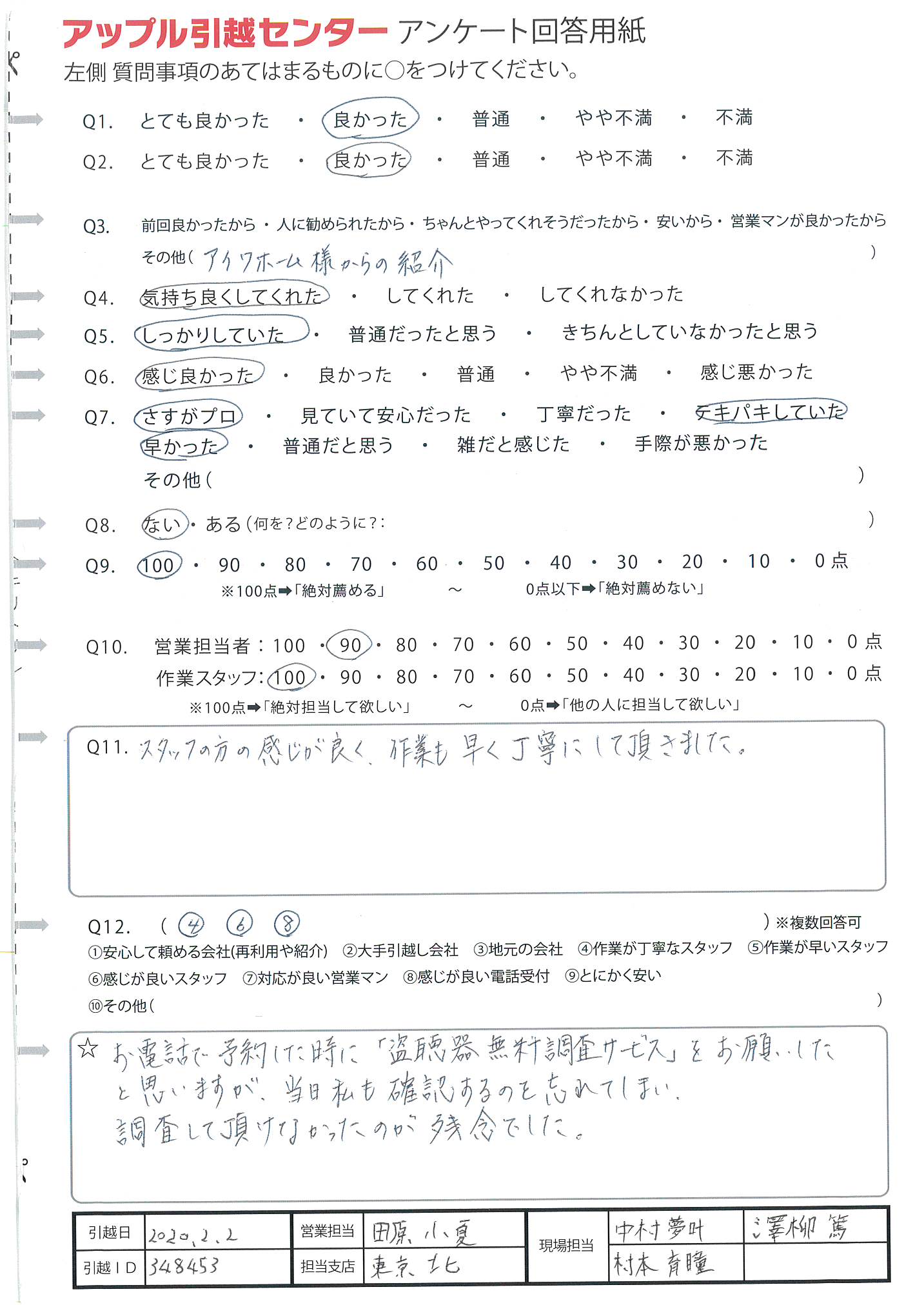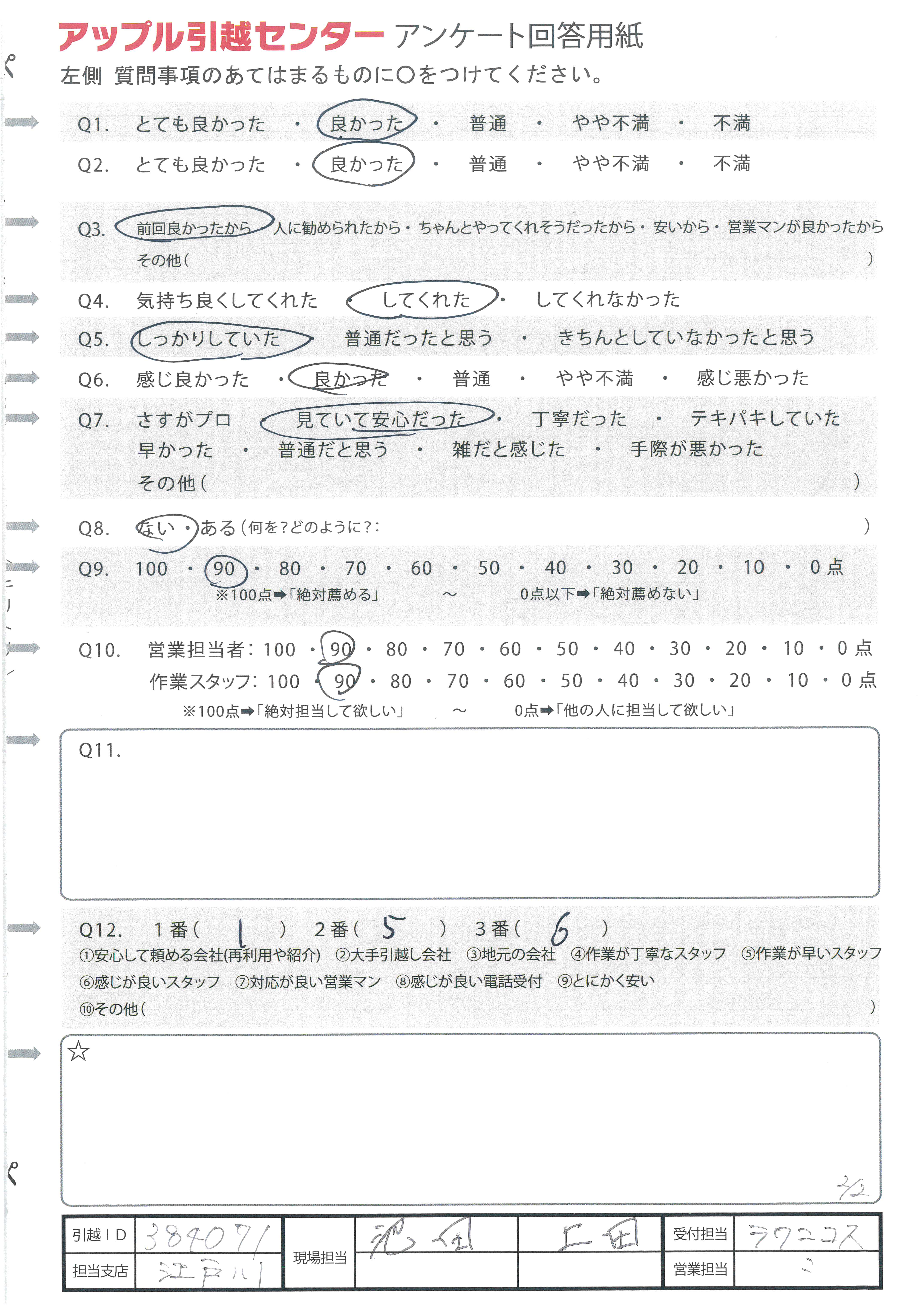 A.本当に親切に、しっかりサポート頂き、自分、友人が引っ越すときにはまた利用させて頂くかすすめたいと思いました。