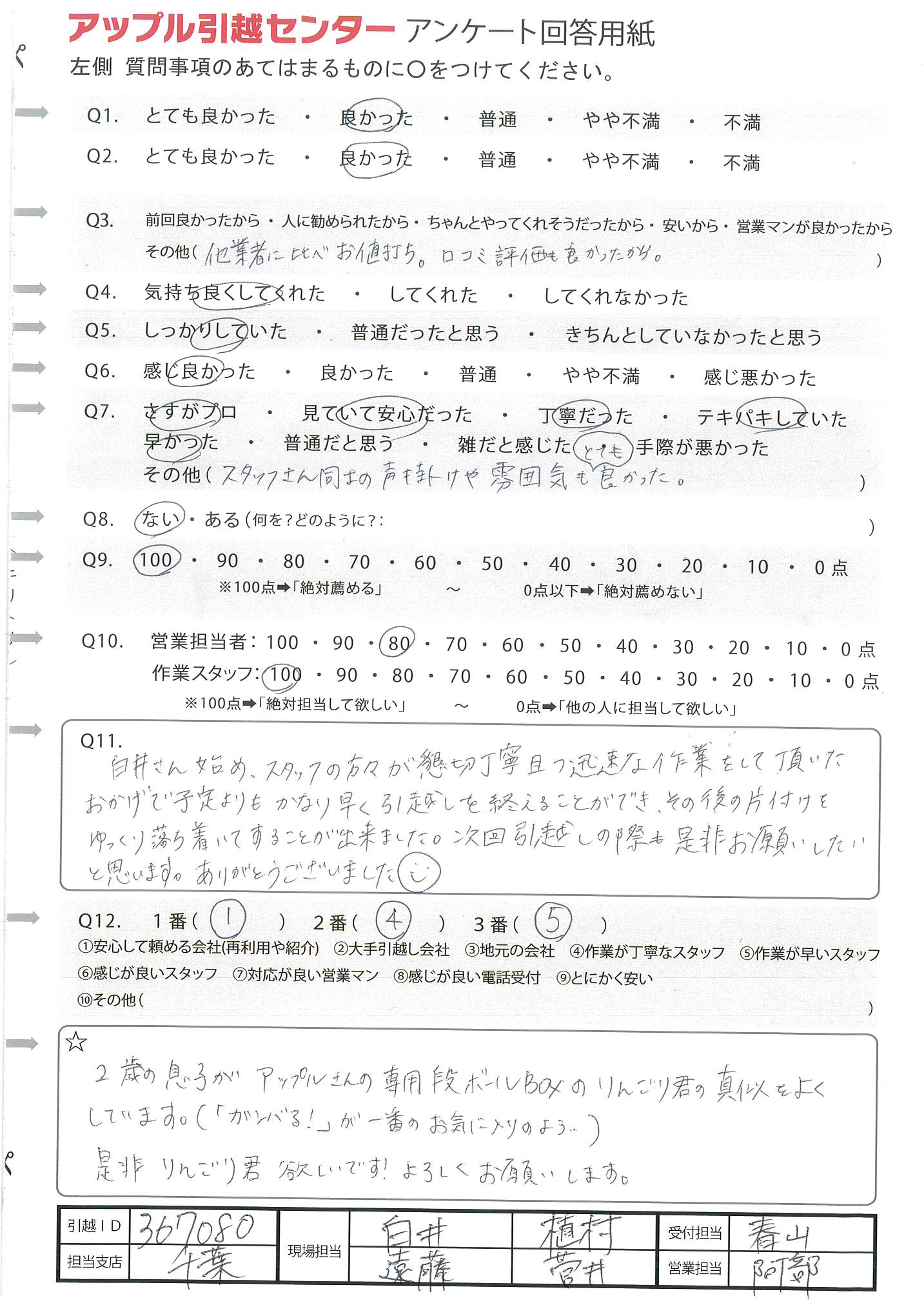 A.白井さん始め、スタッフの方々が懇切丁寧且つ迅速な作業をして頂いたおかげで予定よりもかなり早く引越しを終えることができ、その後の片付けをゆっくり落ち着いてすることが出来ました。 次回引越しの際も是非お願いしたいと思います。 ありがとうございました。