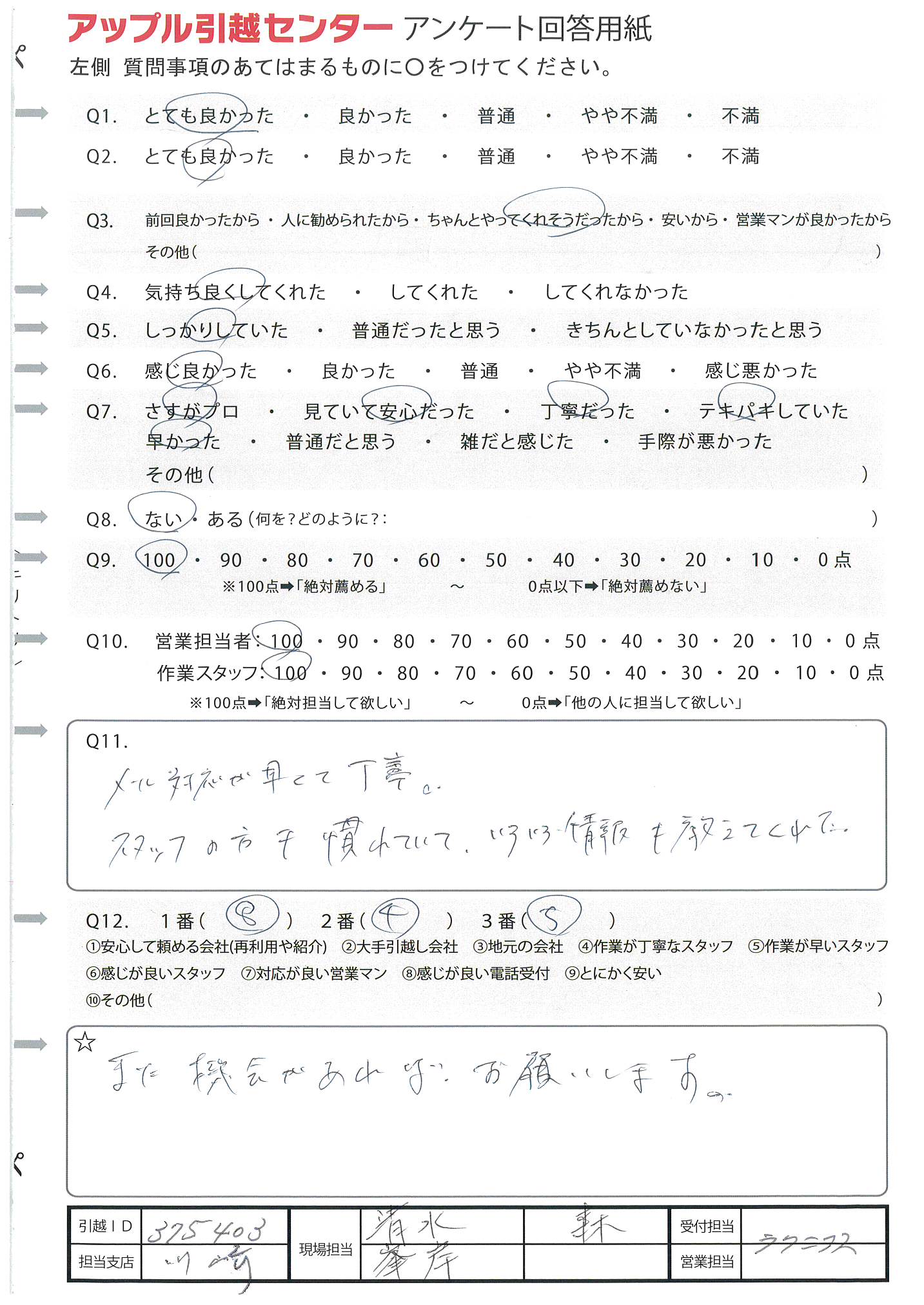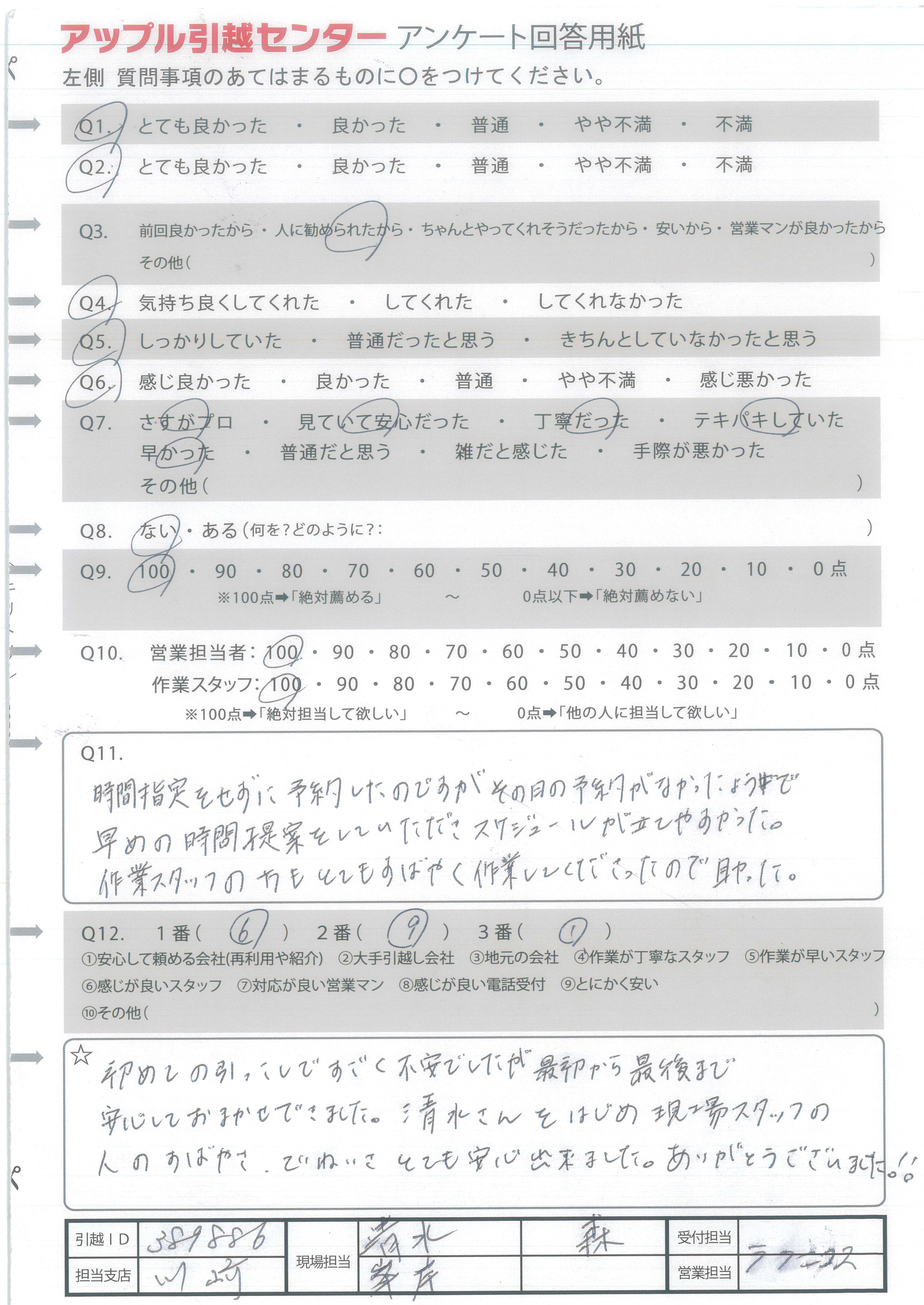 A.初めての引越しですごく不安でしたが最初から最後まで安心しておまかせできました。 清水さんをはじめ現場スタッフの人のすばらしさ、ていねいさとても安心出来ました。 ありがとうございました!!