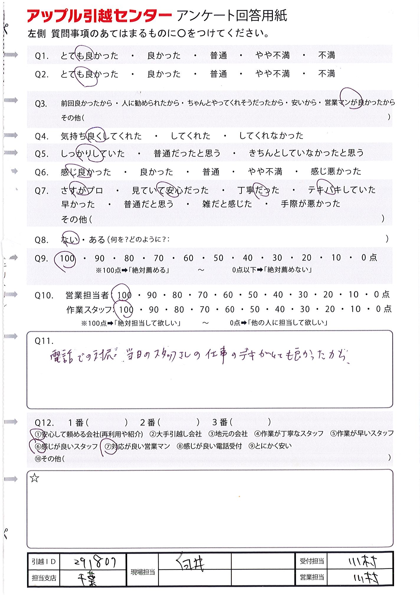 A.9月末にお願いしたのですがアンケートを答えるのが遅くなりすみません。 久しぶりの引越しだったのでどうしたらいいのかわかっていませんでしたが、そんなことを考える必要なかったと思うほどテキパキ作業して下さりありがとうございました。 スタッフさんも感じがよく好感がもてました。 これまで何度か引越ししてきましたが1番よかったです。 ほんとうにありがとうございました