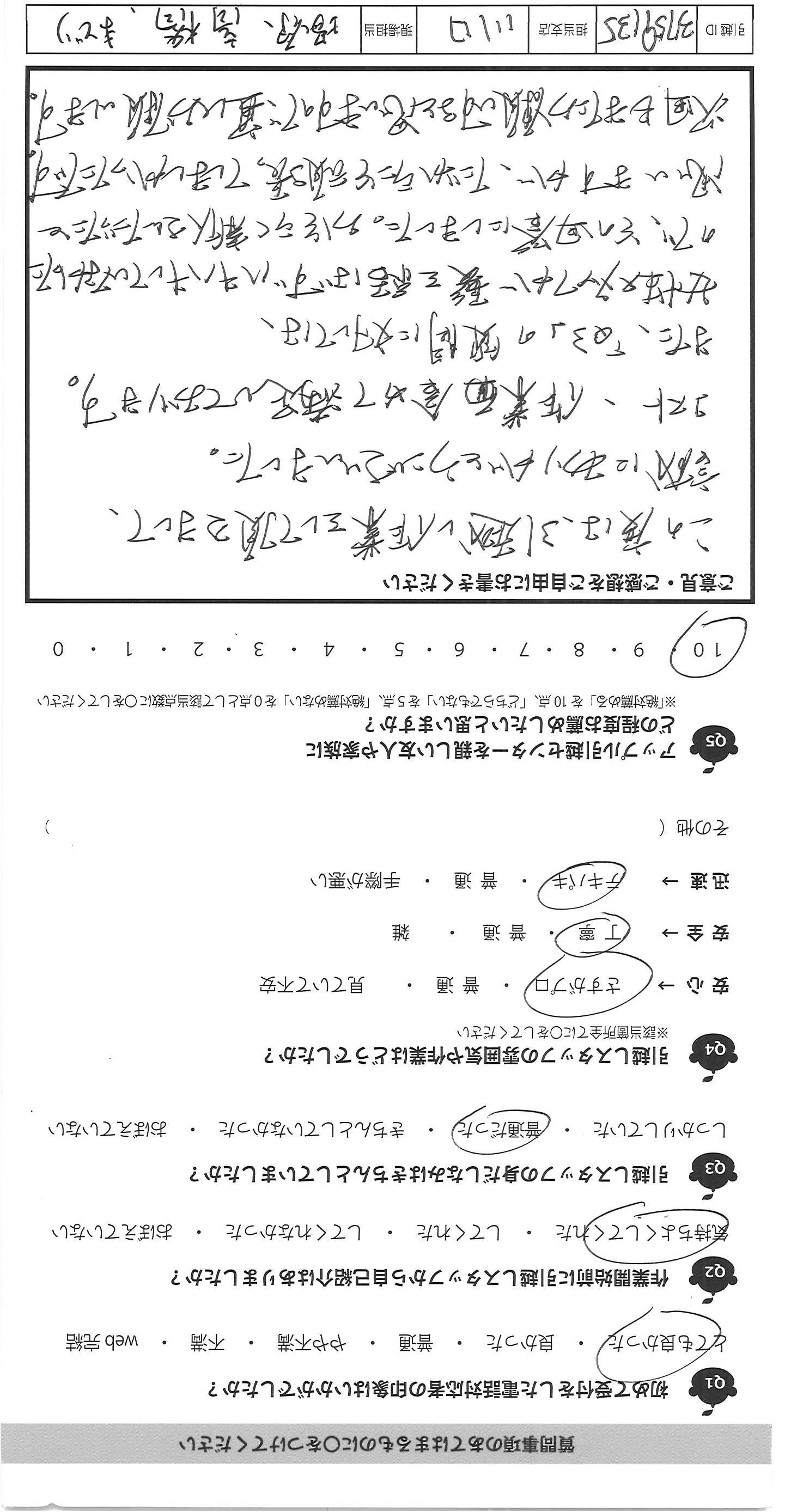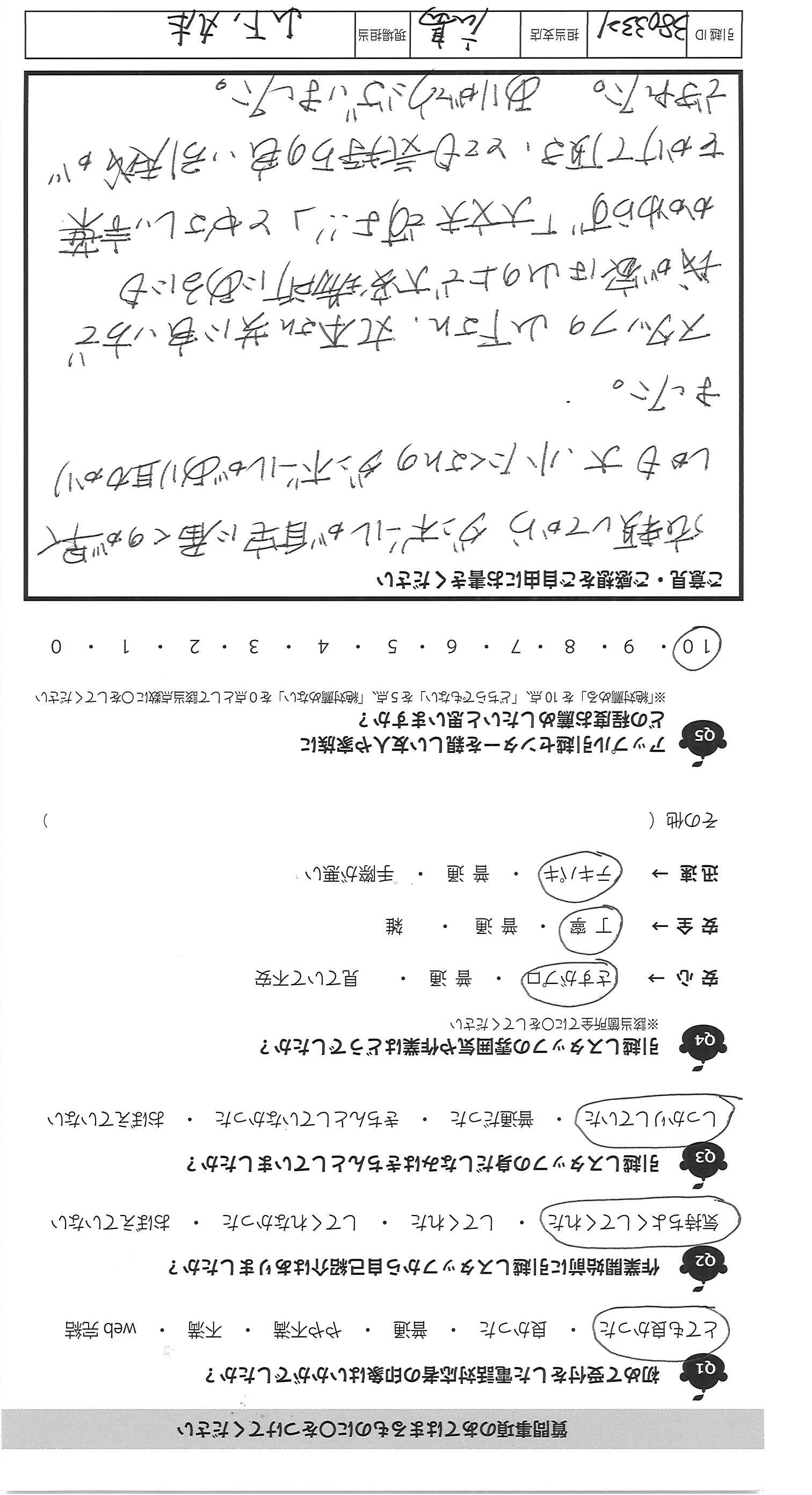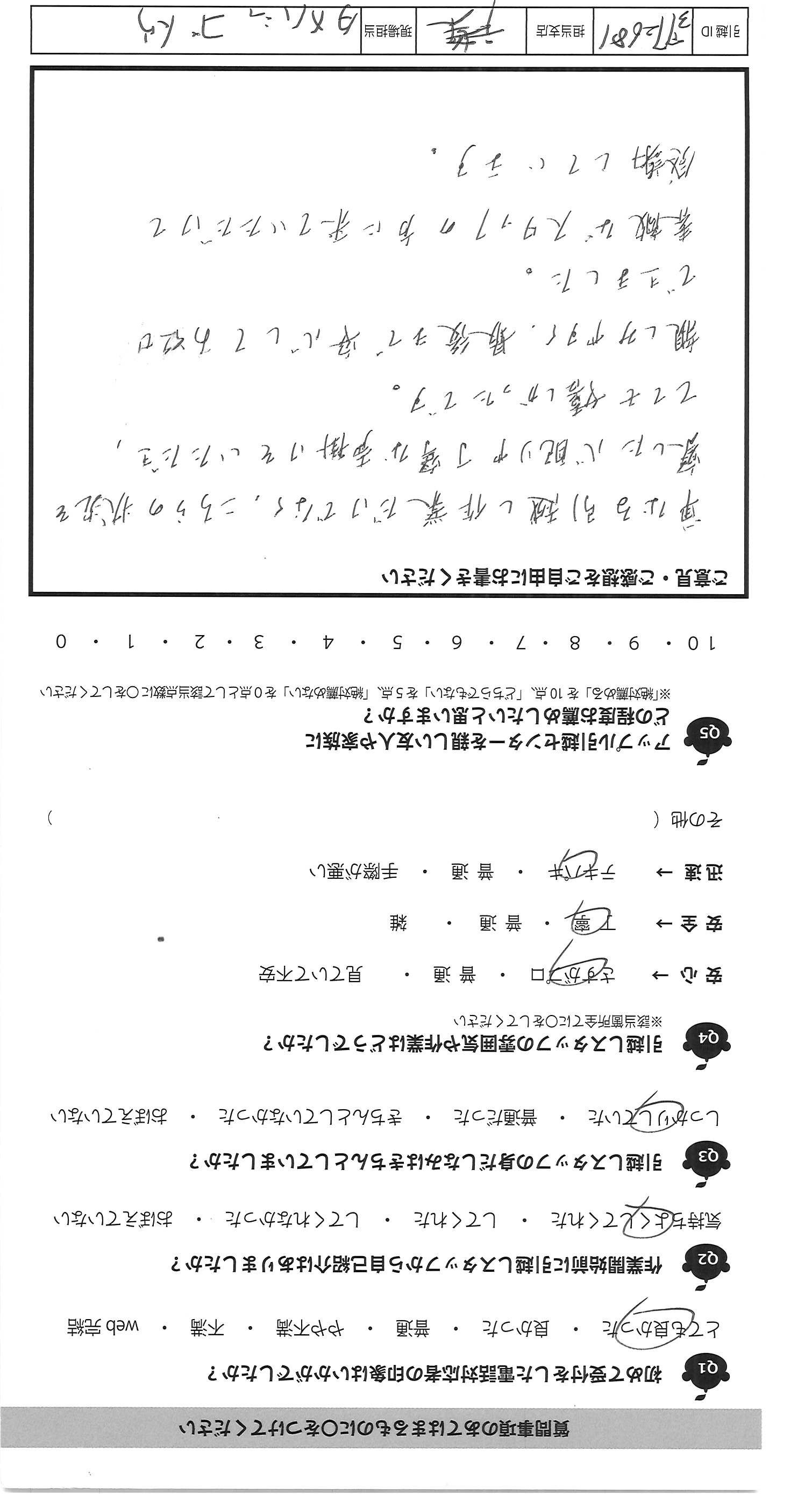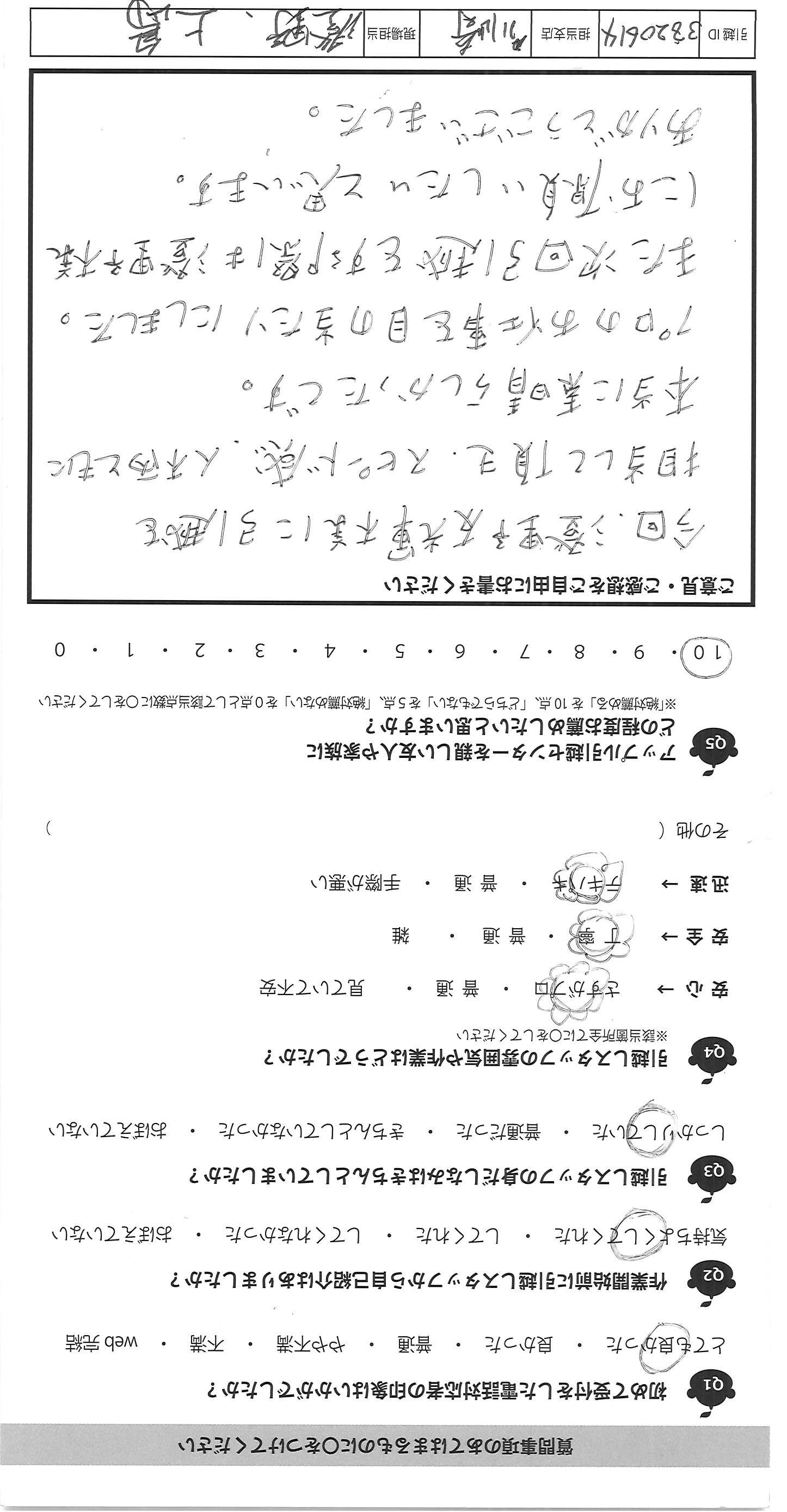 A.この度は、引越し作業をして頂きまして、 誠にありがとうございました。 コスト、作業面含めて満足しております。 また、「Q3」の質問に対しては、 女性スタッフが髪を結ばずハキハキしていなかった ので、その回答にしました。おそらく新人さんだったと 思いますが、だからこそ頑張ってほしかったです。 次回もまたお願いすると思いますので、宜しくお願いします。