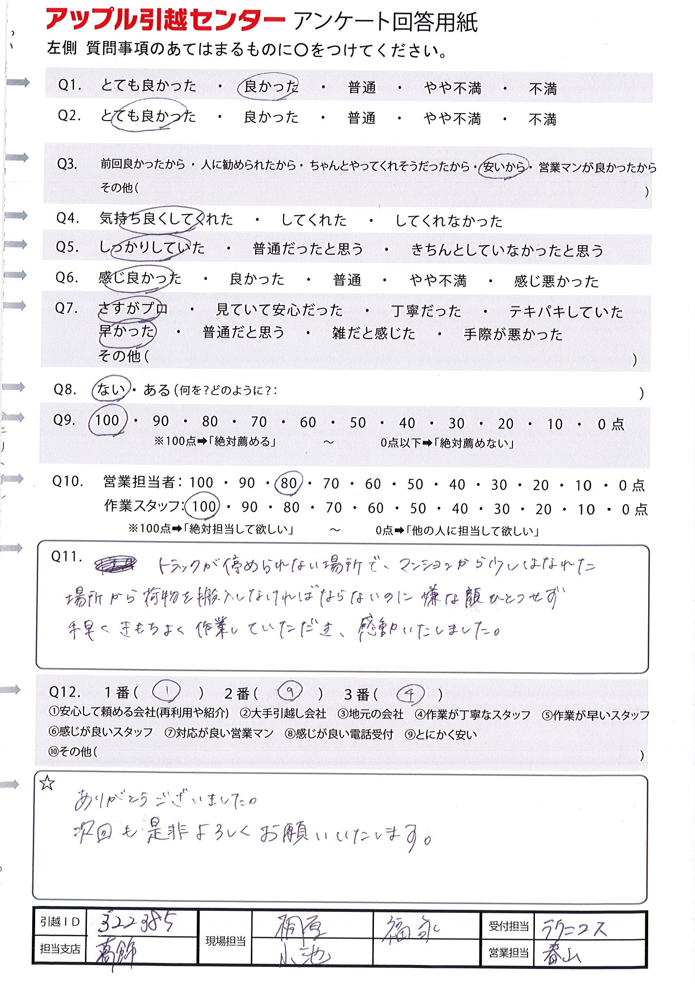 A.トラックが停められない場所で、マンションから少しはなれた場所から荷物を搬入しなければならないのに嫌な顔ひとつせず手早くきもちよく作業していただき、感動いたしました。