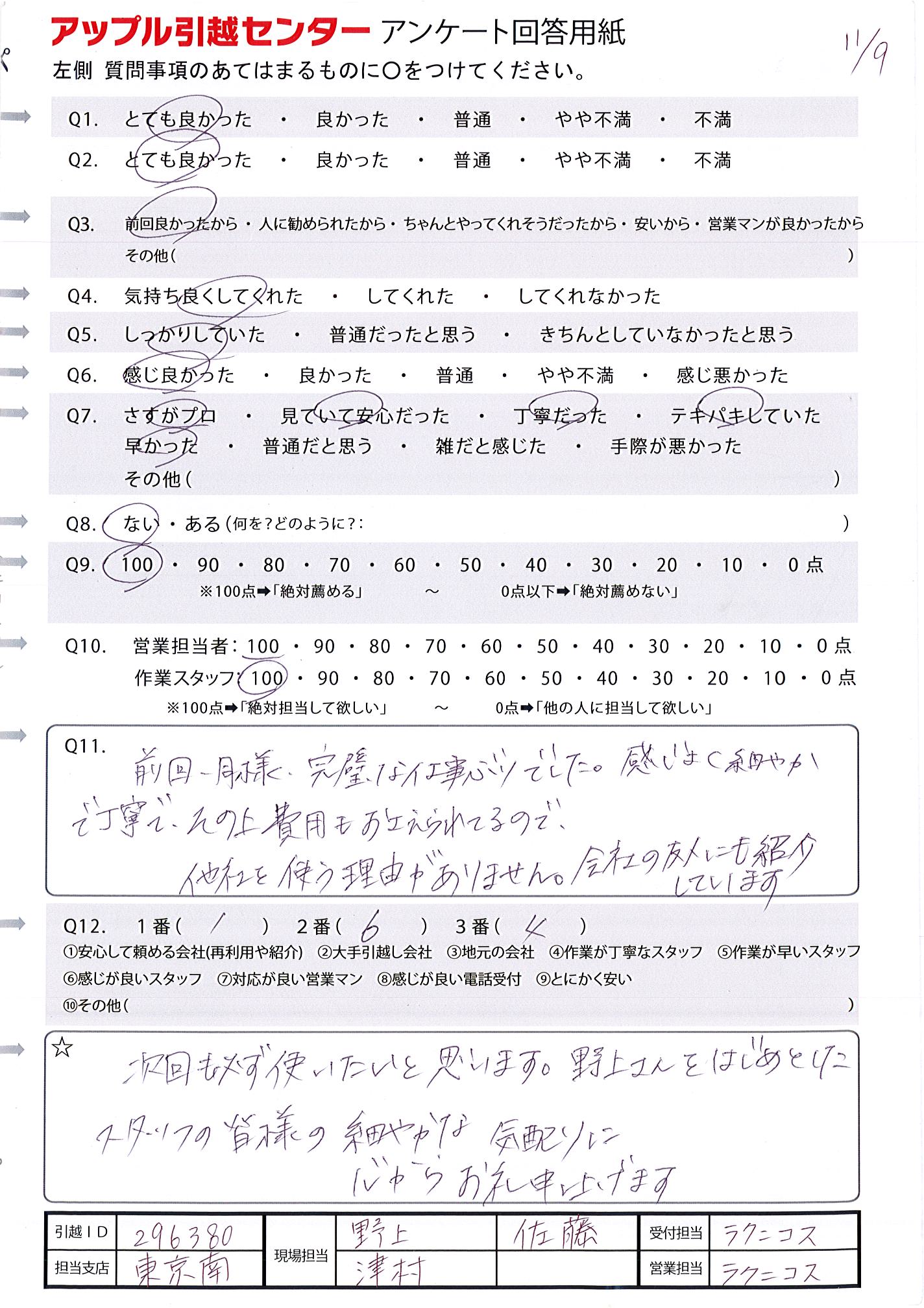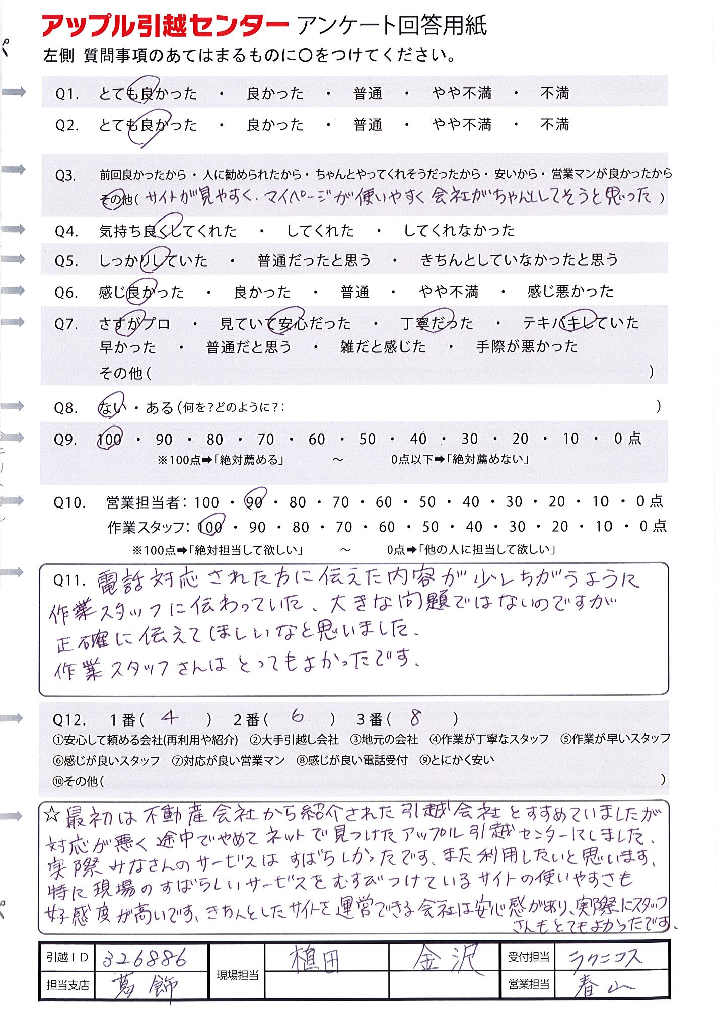 A.上記にも記載した通り、お電話から当日の作業まで本当に素晴らしく感謝しております。 正直、このお値段でこのサービスを受けられたのは本当にラッキーだったと思っております。 このマイページも、お電話での見積り後の片付け中に色々と追加・編集ができてとても助かりました。 次回の引っ越しする際にも必ずお願いしようと思います。 本当にありがとうございました。