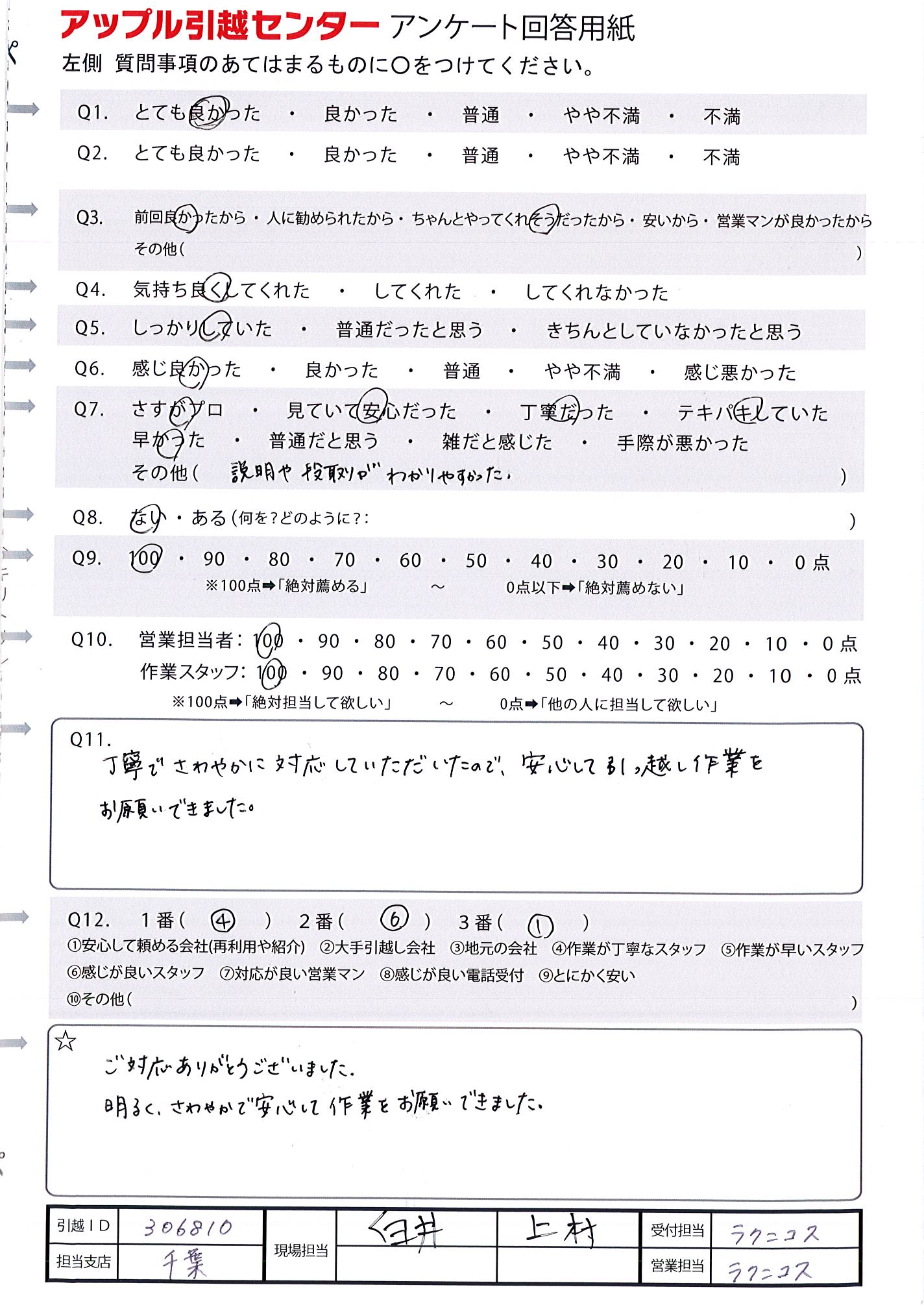 A.丁寧でさわやかに対応していただいたので、安心して引っ越し作業をお願いできました。