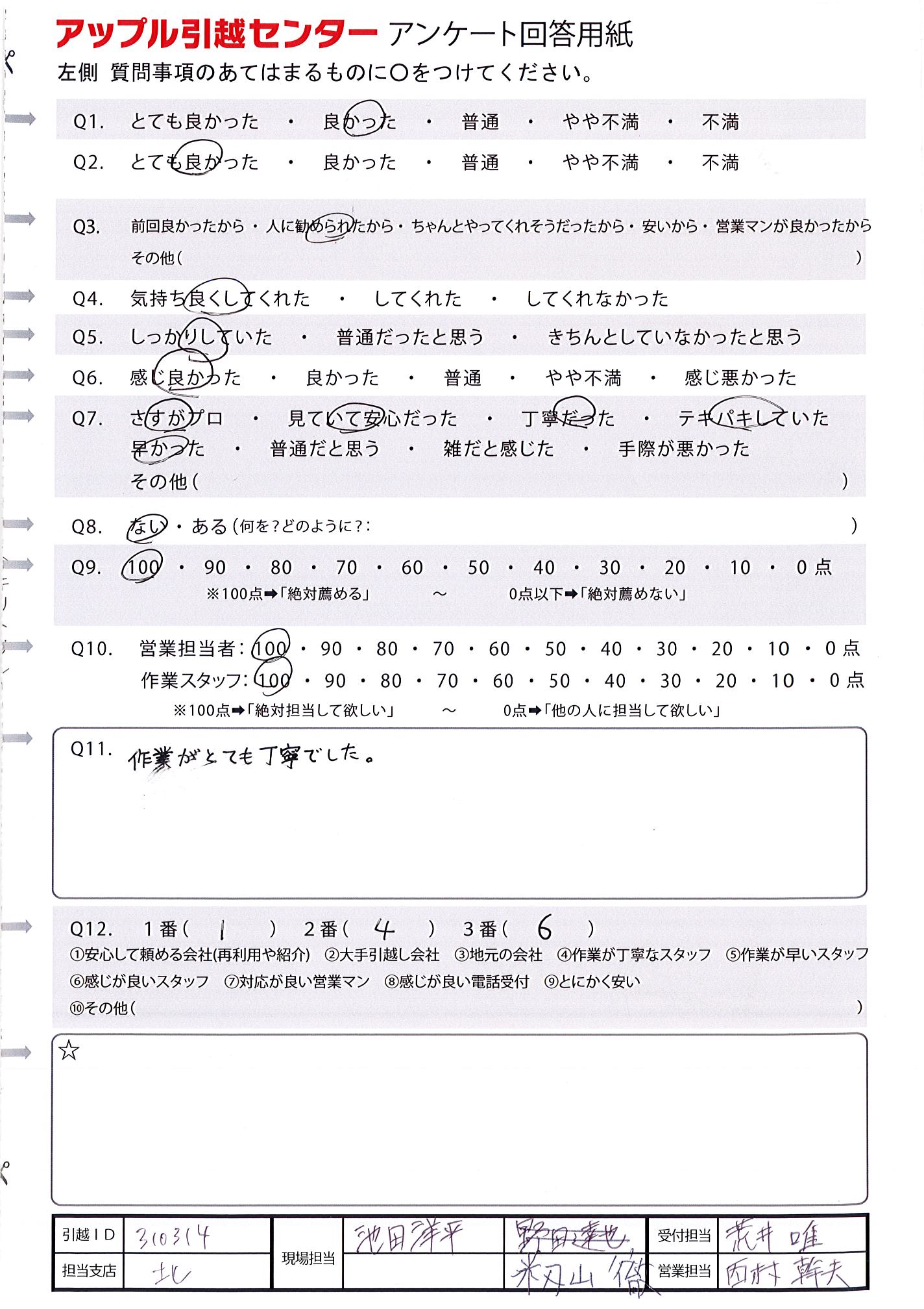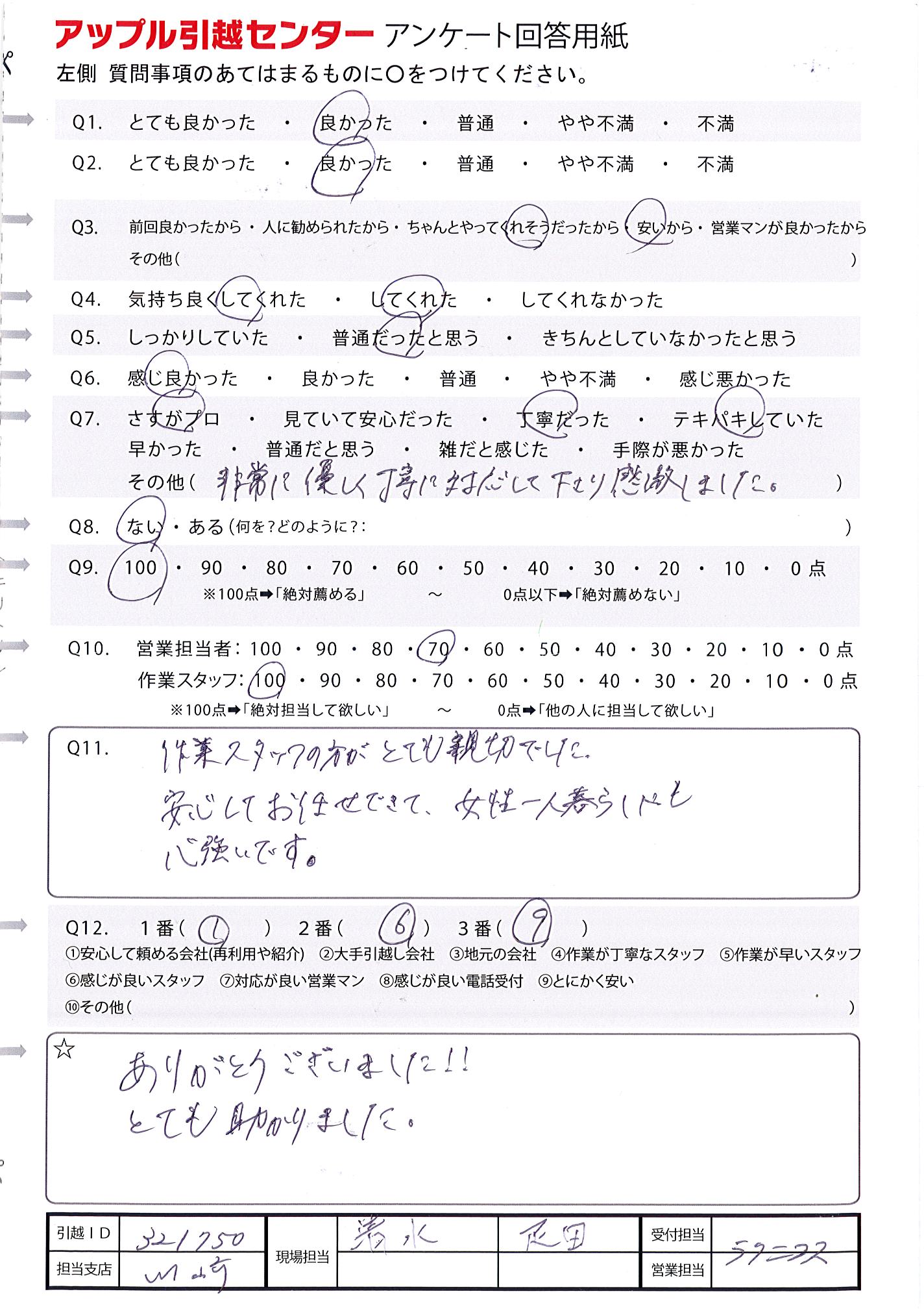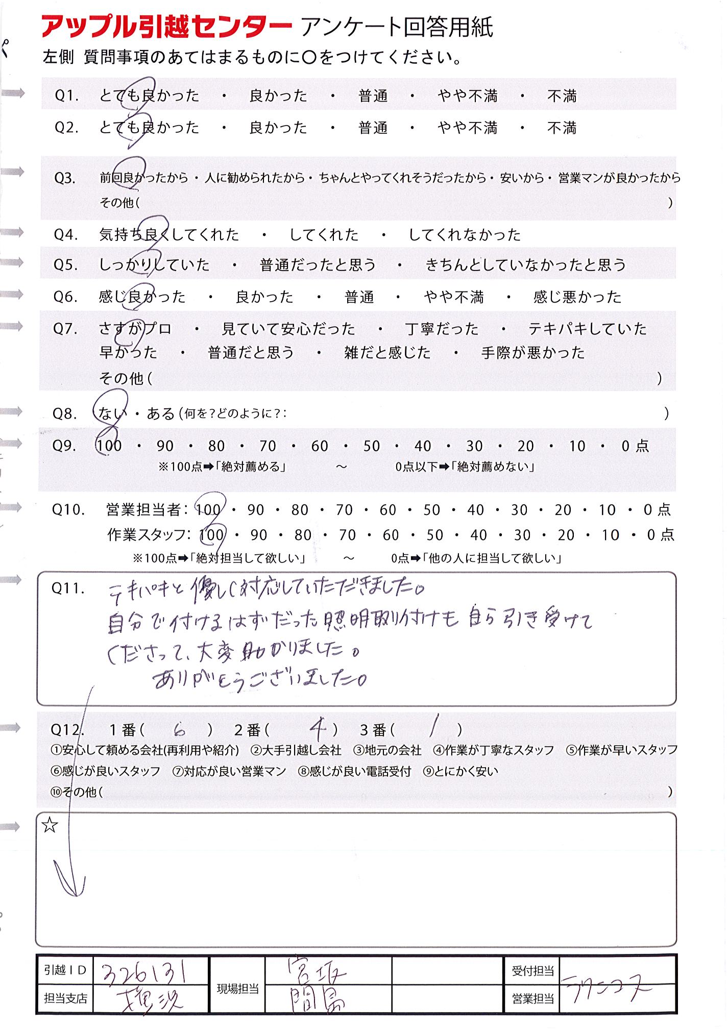 A.とても親切で明るく感じの良いスタッフさんでした。引越しも最初から最後まで迅速に対応していただき、ありがとうございました。初めて頼みましたが安く対応も良かったので、また次回引っ越す機会があれば検討させていただきたいと思います。出口さん、福永さん、酒井さんありがとうございました。