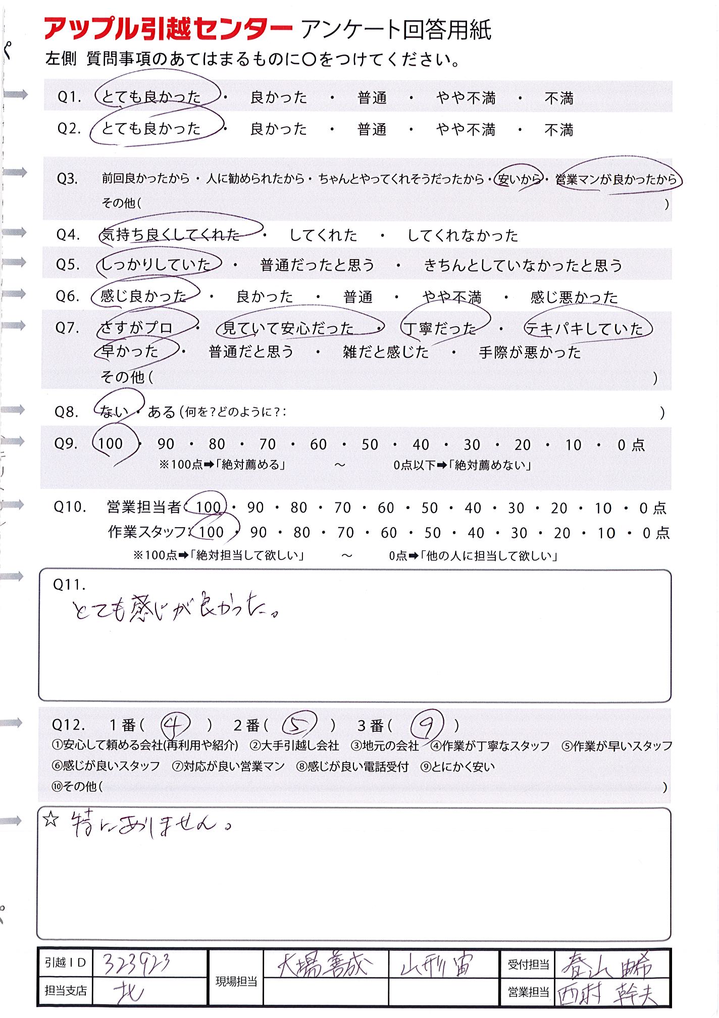 A.お安い料金で丁寧な対応をしてくださってとても感謝しております。 お忙しくなられても、今後も変わらない対応であってほしいです。 また、いつか引越しする時はお願いしたいと思っています。