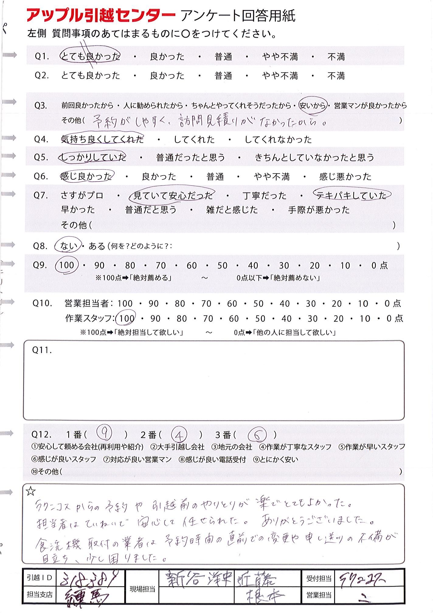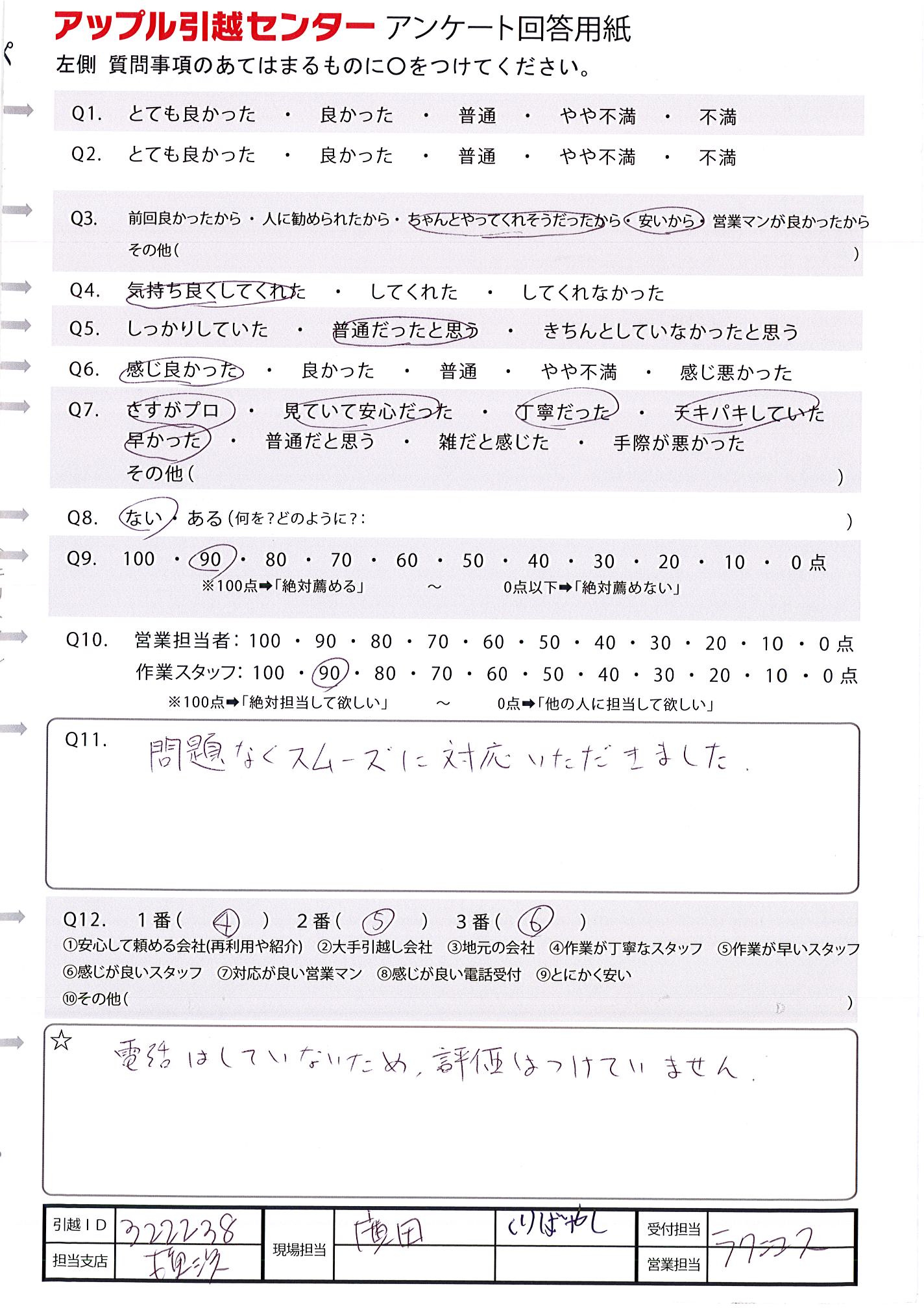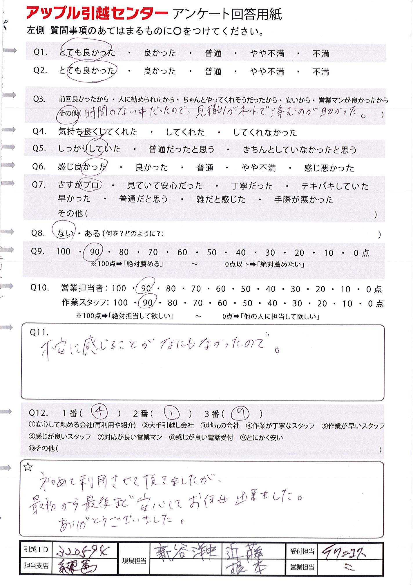 A.とても感じが良く、非常に親身になって対応して頂きました。 家電の設置もしっかり確認して頂いたり、粗大ゴミの置き場所も色々と考えて頂き感謝です。 ありがとうございました。 また機会がありましたら、宜しくお願い致します。