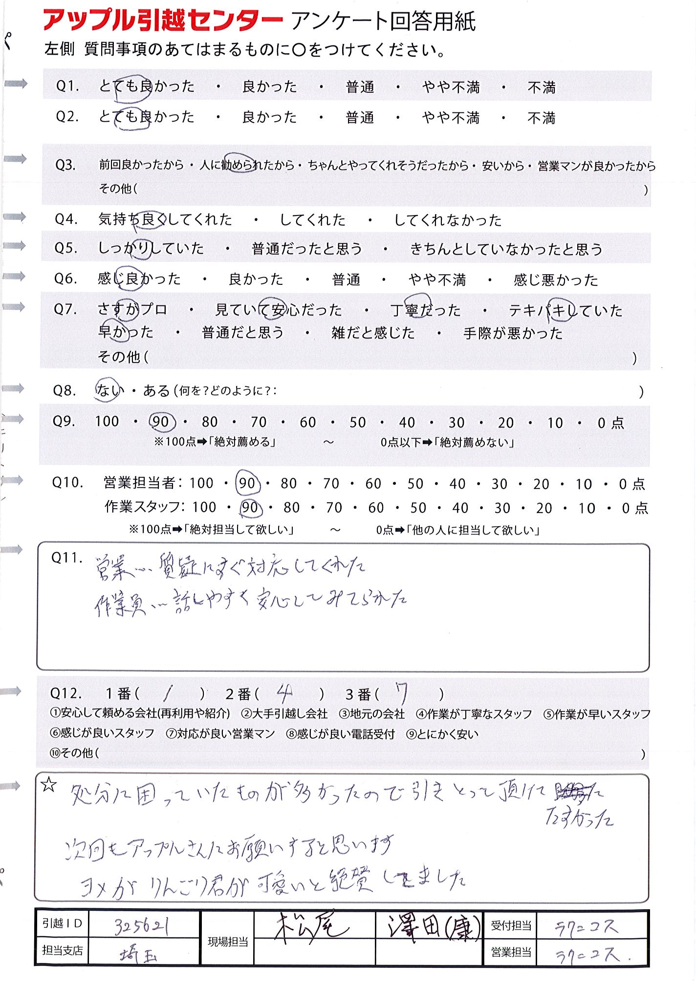 A.作業スタッフさん達の手際がとても良く、無駄なく効率良く進めていただき助かりました。 当日の急な引き取りの希望も受け入れていただきありがとうございました。