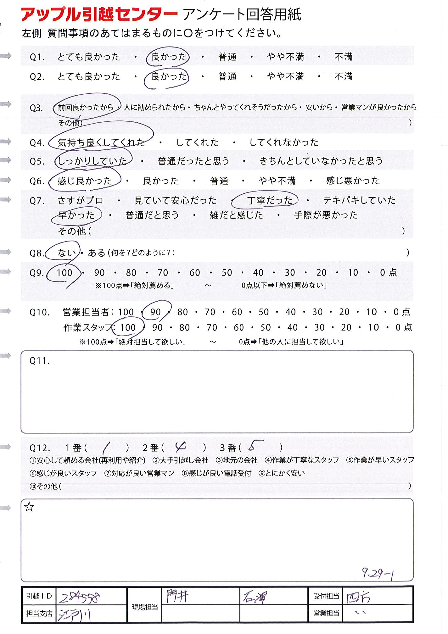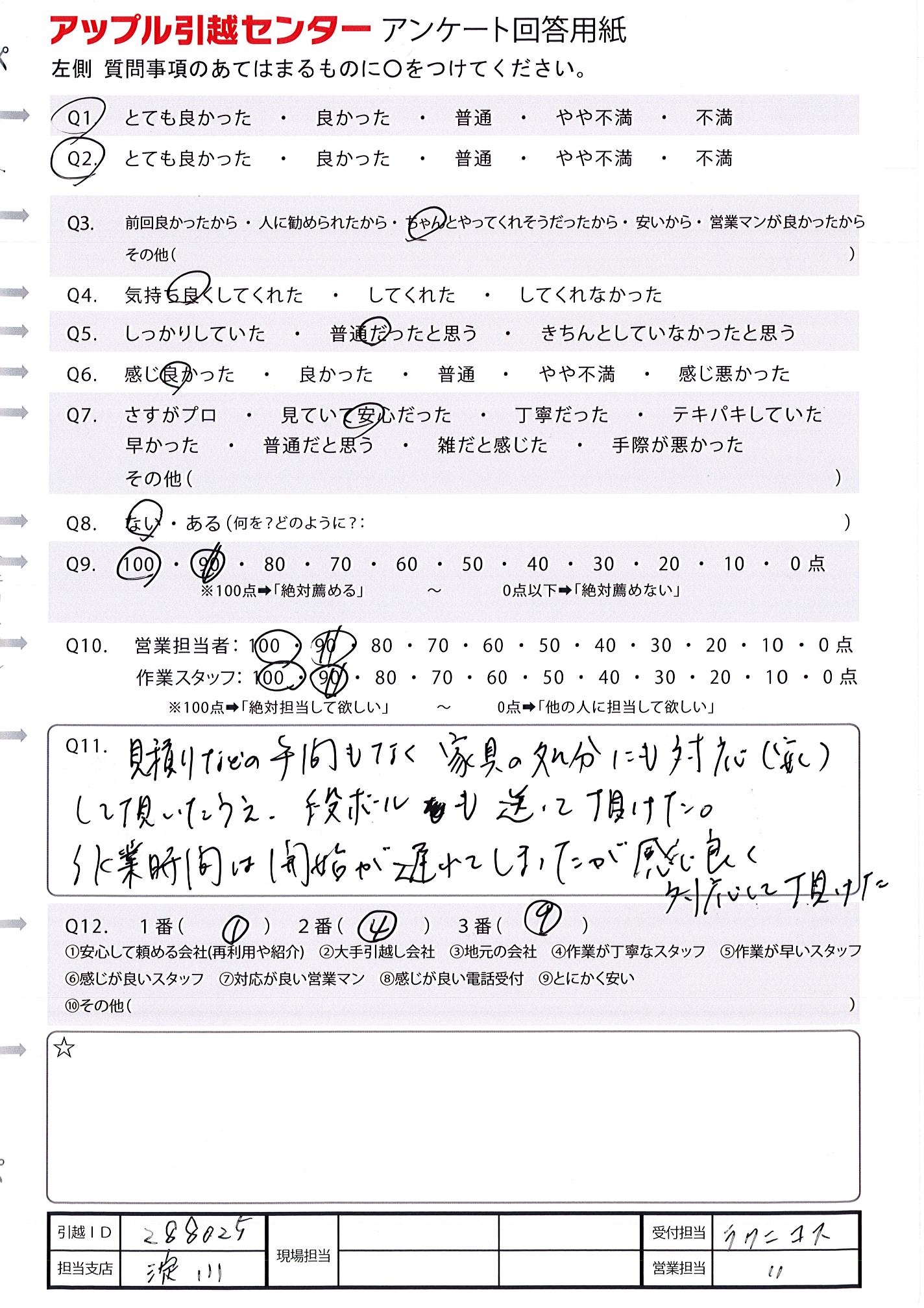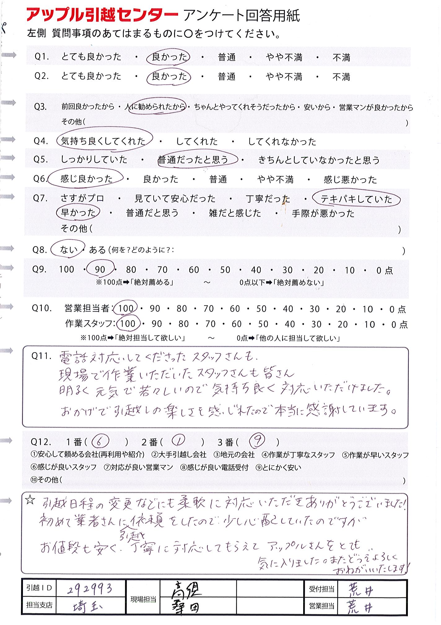 A.若手の方に指導をしながら手際よく作業をしていただけた。 今まで引越しをしたことがなかったので、あまりのスピードに驚きました。 お値段もリーズナブルで、とても感じもよく、感謝でした。