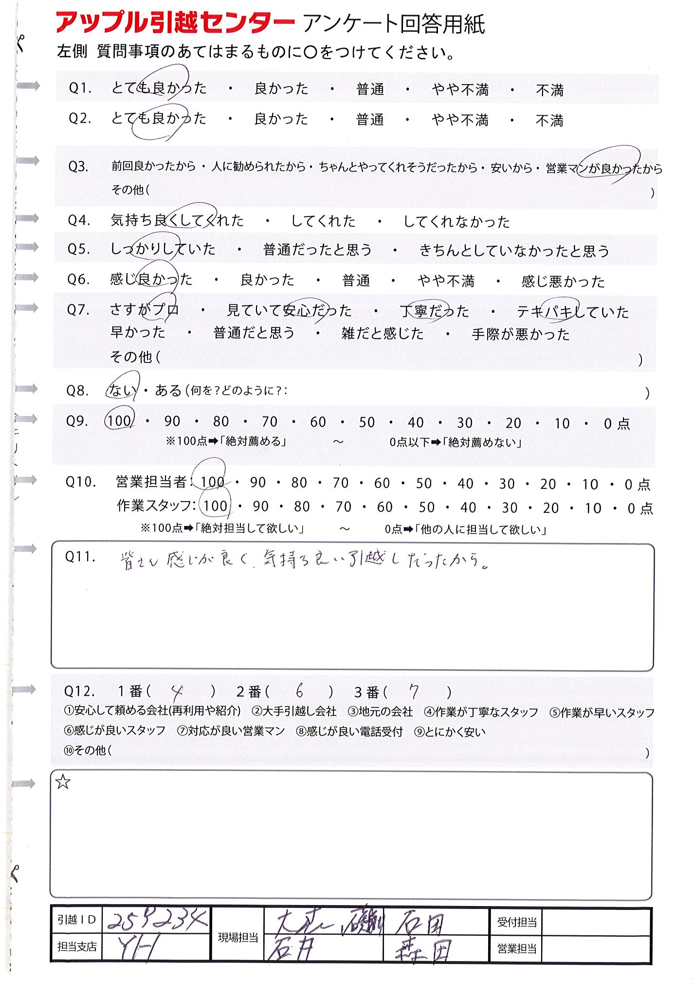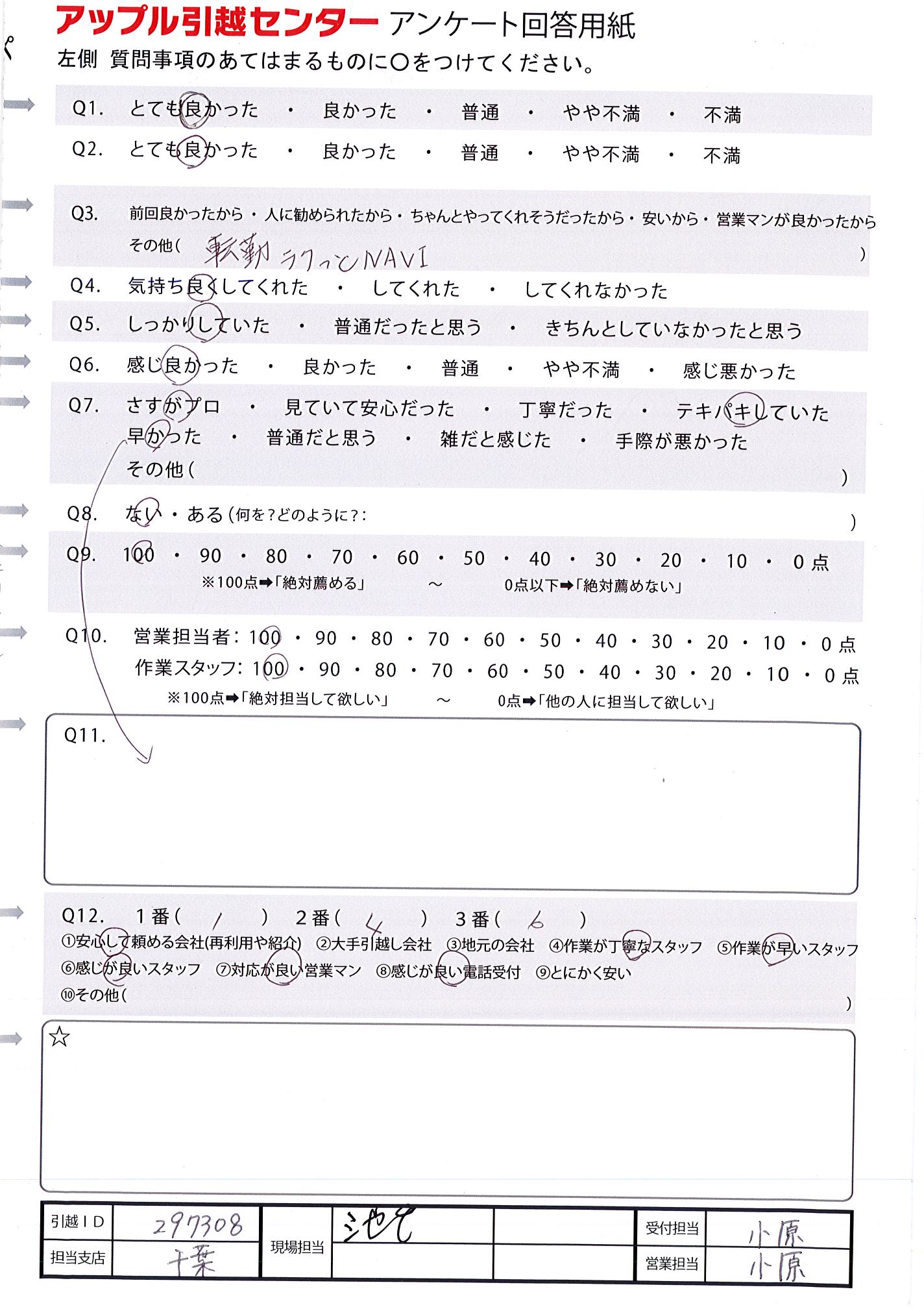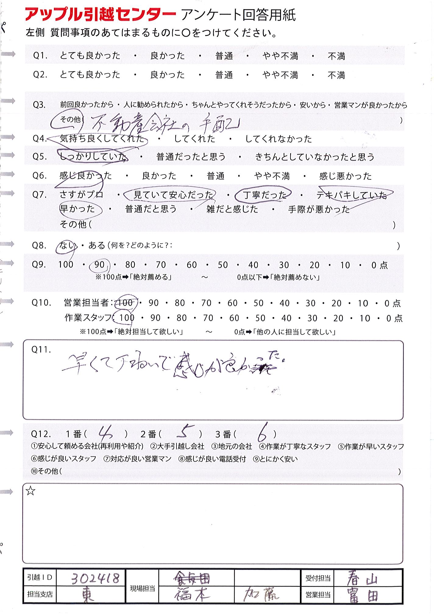 A.Q11と重なってしまいますが、短時間で作業していただき、ありがとうございました! 久々の引越しで不安だったのですが、手際よく作業していただけて安心することができました。
