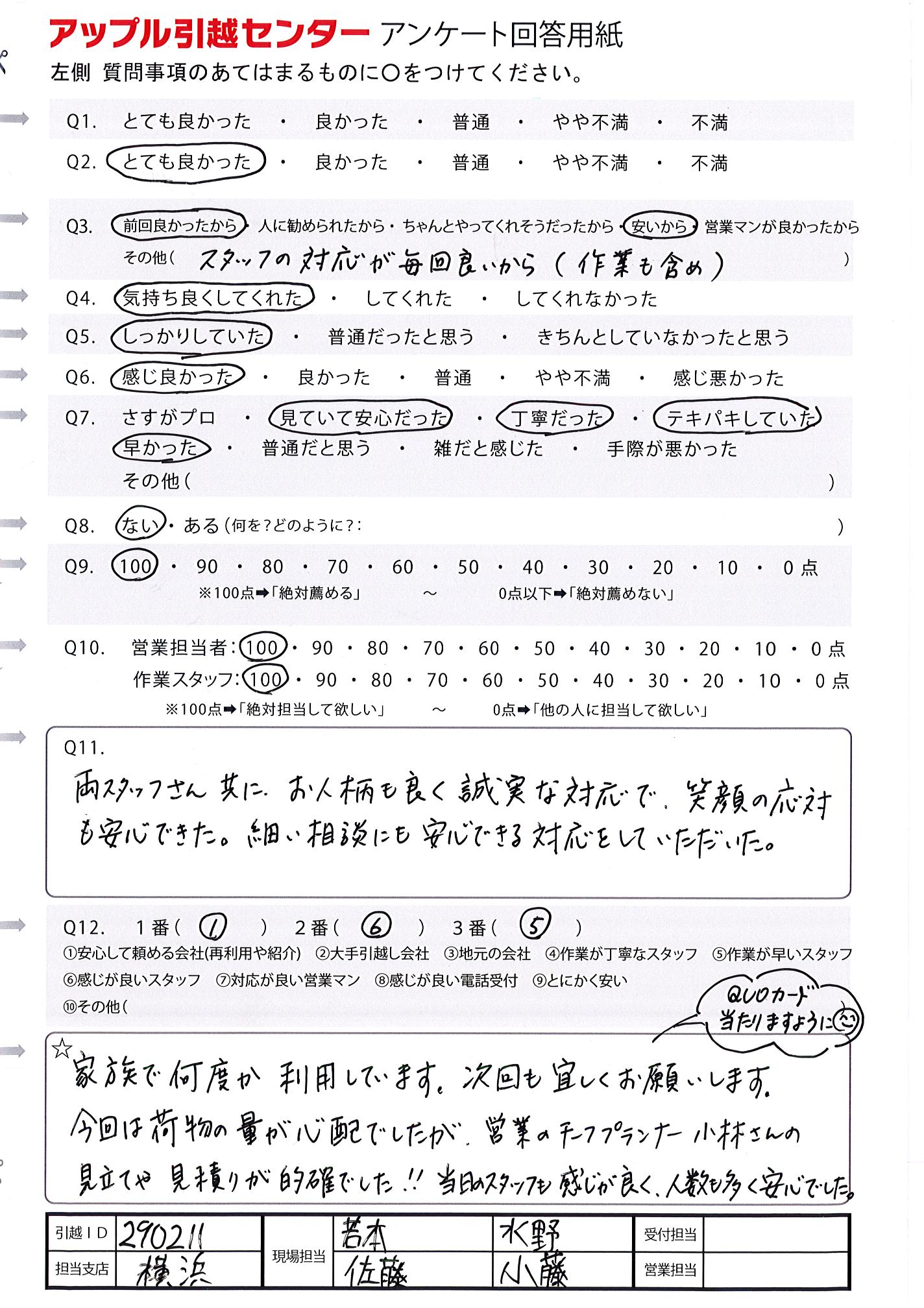 A.家族で何度か利用しています。 次回も宜しくお願いします。 今回は荷物の量が心配でしたが、営業のチーフプランナー小林さんの見立てや見積りが的確でした!! 当日のスタッフの感じが良く、人数も多く安心でした。 QUOカード当たりますように
