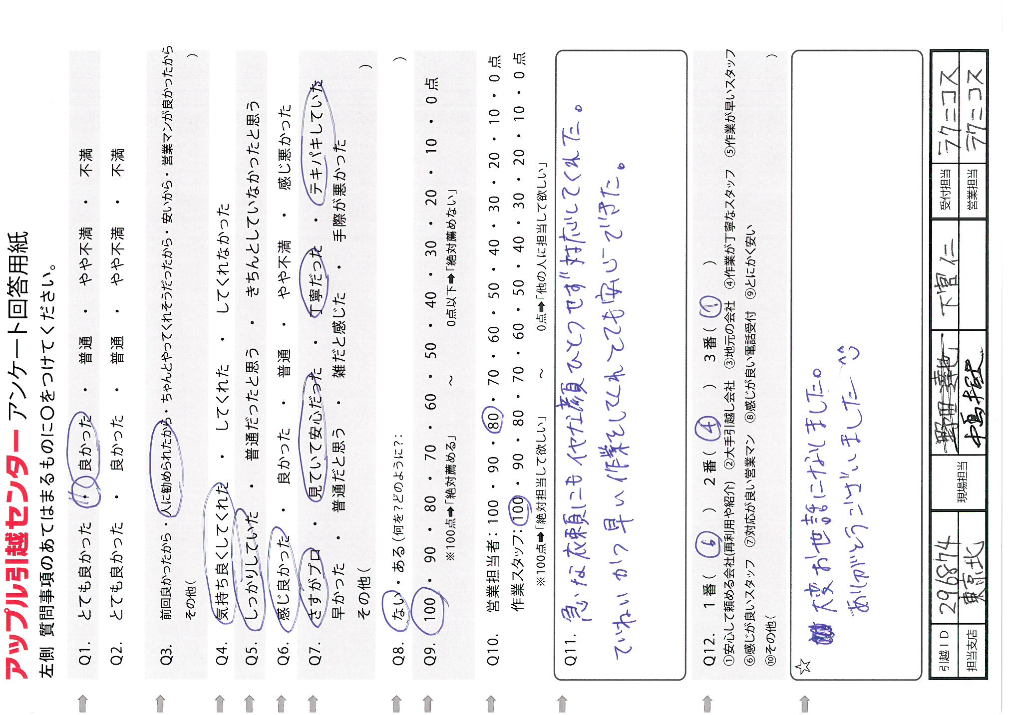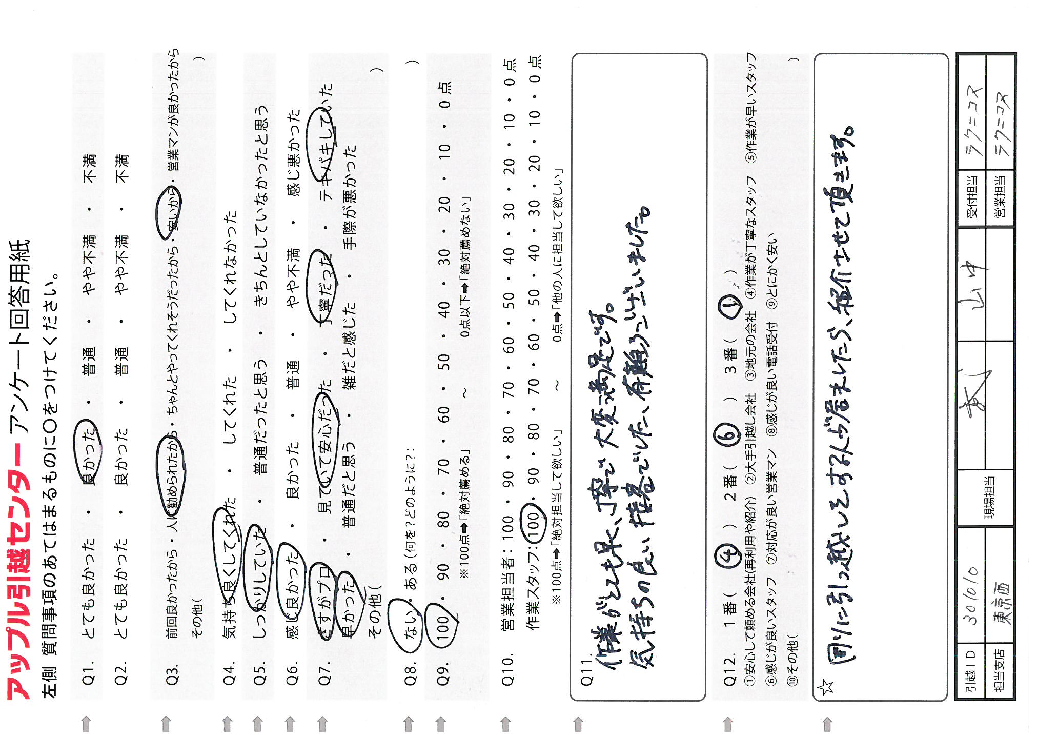 A.國田さんのハキハキした対応、テキパキとした作業はもちろん、作業に当たっての注意点の伝達、新居での家具の配置や最初からついていた傷に関する提案もしていただき助かりました。