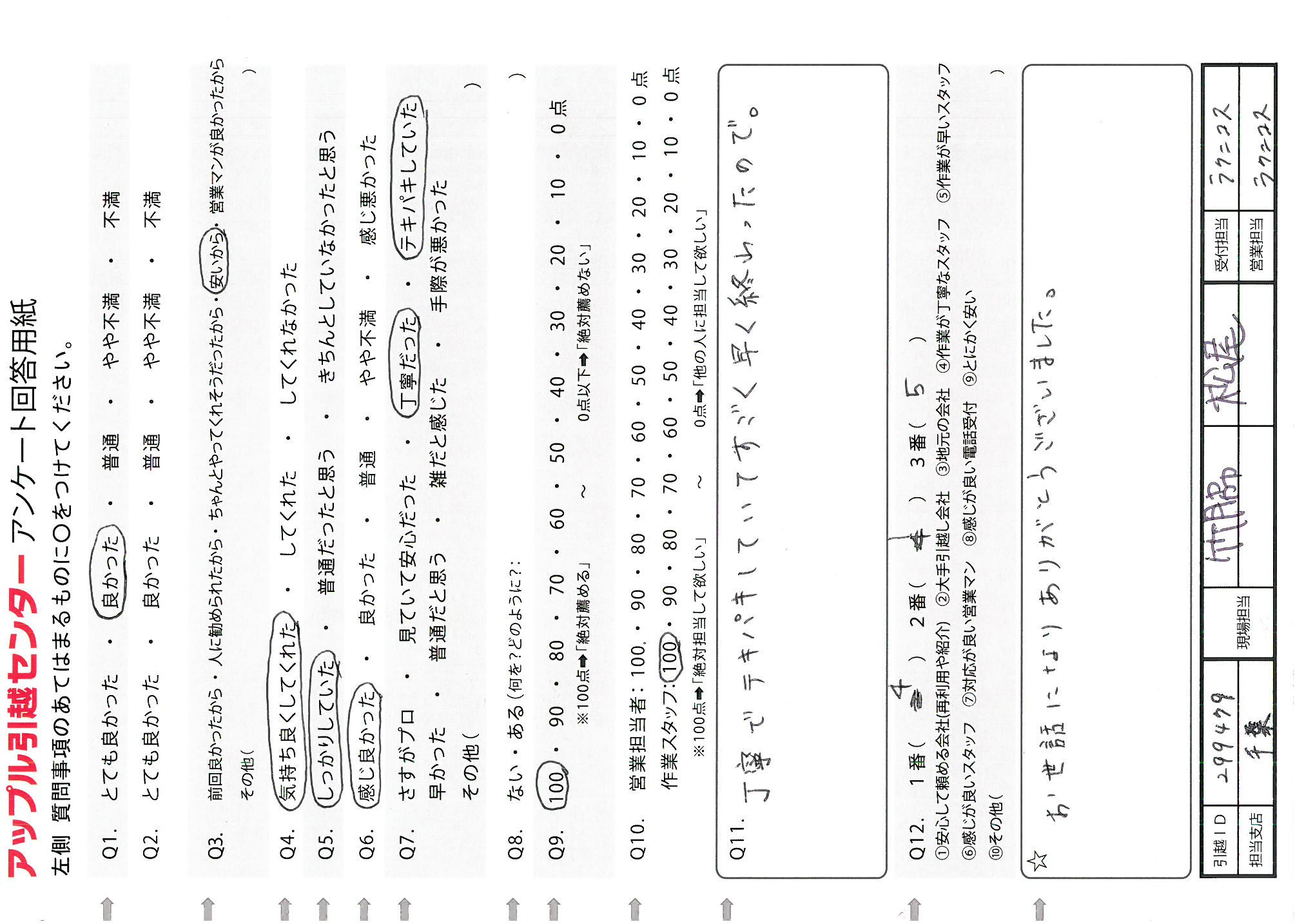 A.とても早くてスムーズに行ってくださいました。 すごく感じも良くて楽しかったです。