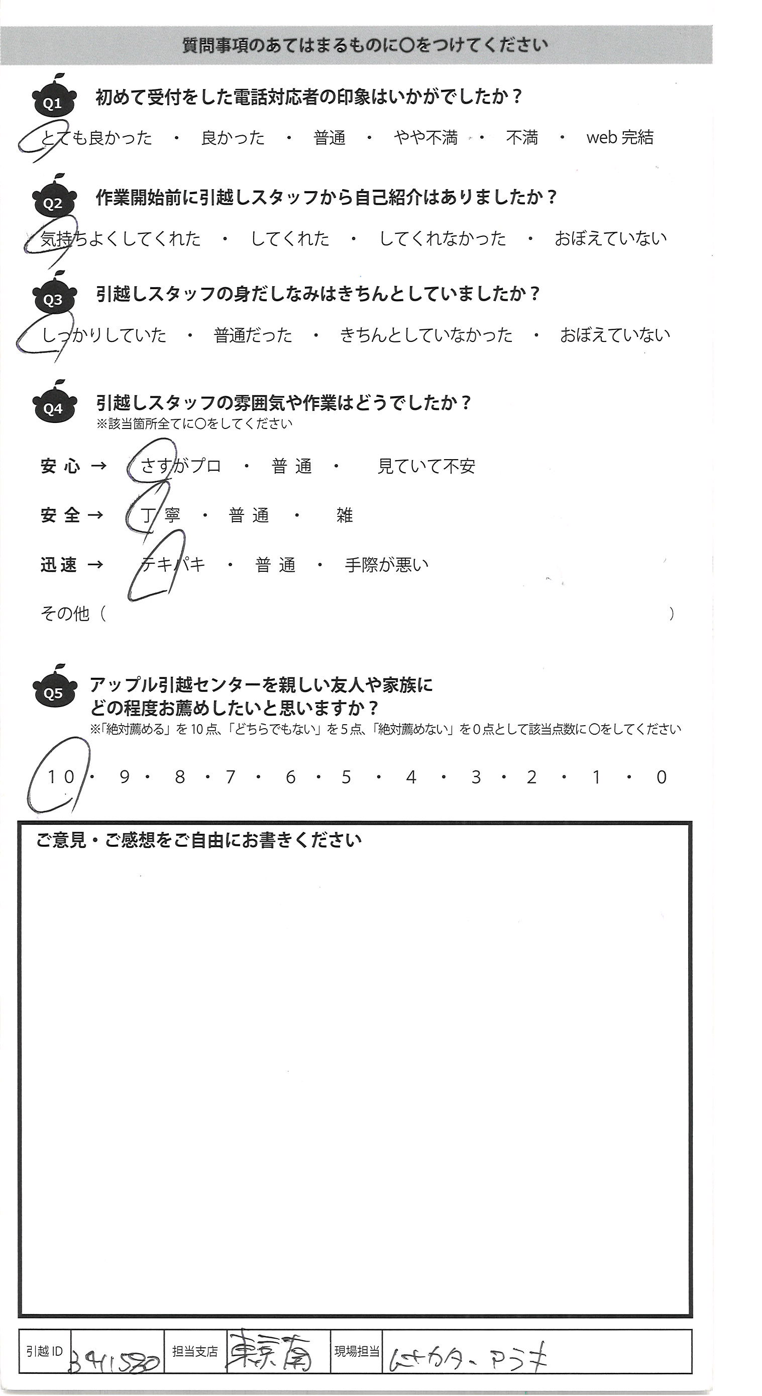 A.あっという間に作業が完了していて、大変驚きました。迅速なのに、とても丁寧な対応でよかったです。ただ、引越し先のオートロックの自動ドアがオフになっていたままでした。連休中だったので管理会社が休みで、どうしようかと思いましたが、他の入居者さんにも聞いたりして動かすことができました。その点を改善していただければと思いました。しかし、サービスは申し分ないのでまた機会があれば是非利用したいです。