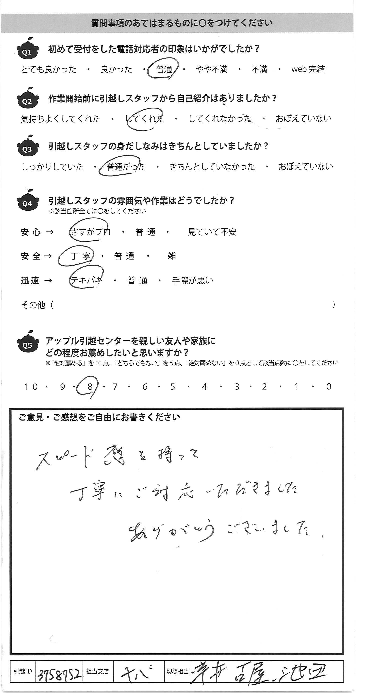 A.作業員さん達の言葉使いが丁ねいで気もちが良 かったです。私も何回か引越ししていますが、良い 方々だと思います。まだご多忙の時が続くと思 いますので、お体を大切に頑張って下さい