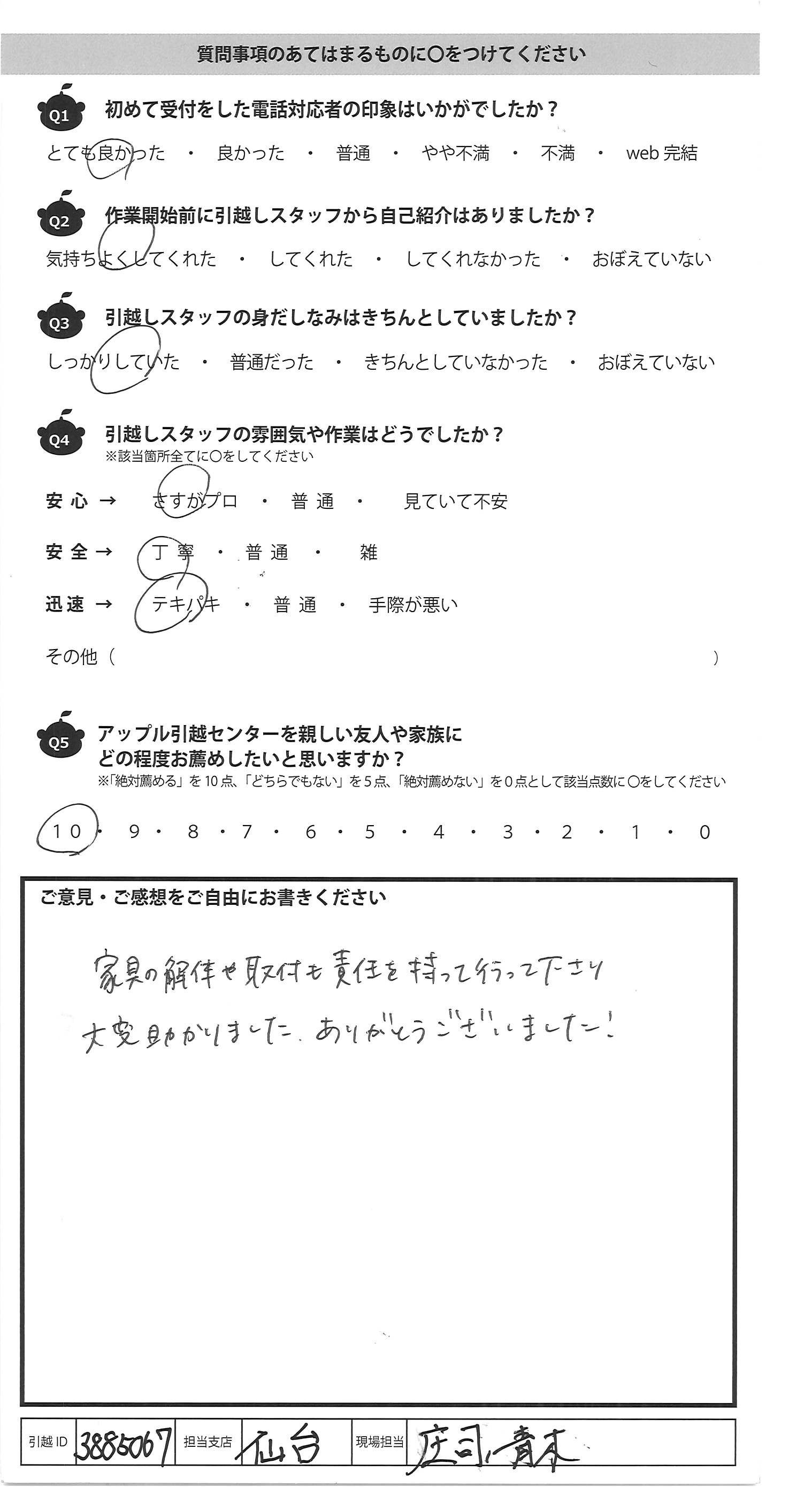 A.こちらの準備が不十分でとても迷惑をおかけした にも関わらず適切で最善の対応と考えて下さり とても感謝しています。 大変な引越しになってしまったのに終始嫌な顔を せず丁寧に対応して下さいました(転居先での) 荷物の運び込みも、細やかに配慮して下さり ありがたかったです。今回アップルさんいなかったら 担当して下さった野口さんではなかったら引越しできて いなかったと思います。以前もアップルさんにお願いして 良かったので今回もお願いしましたが次も必ずアップルさんに したいと思います。