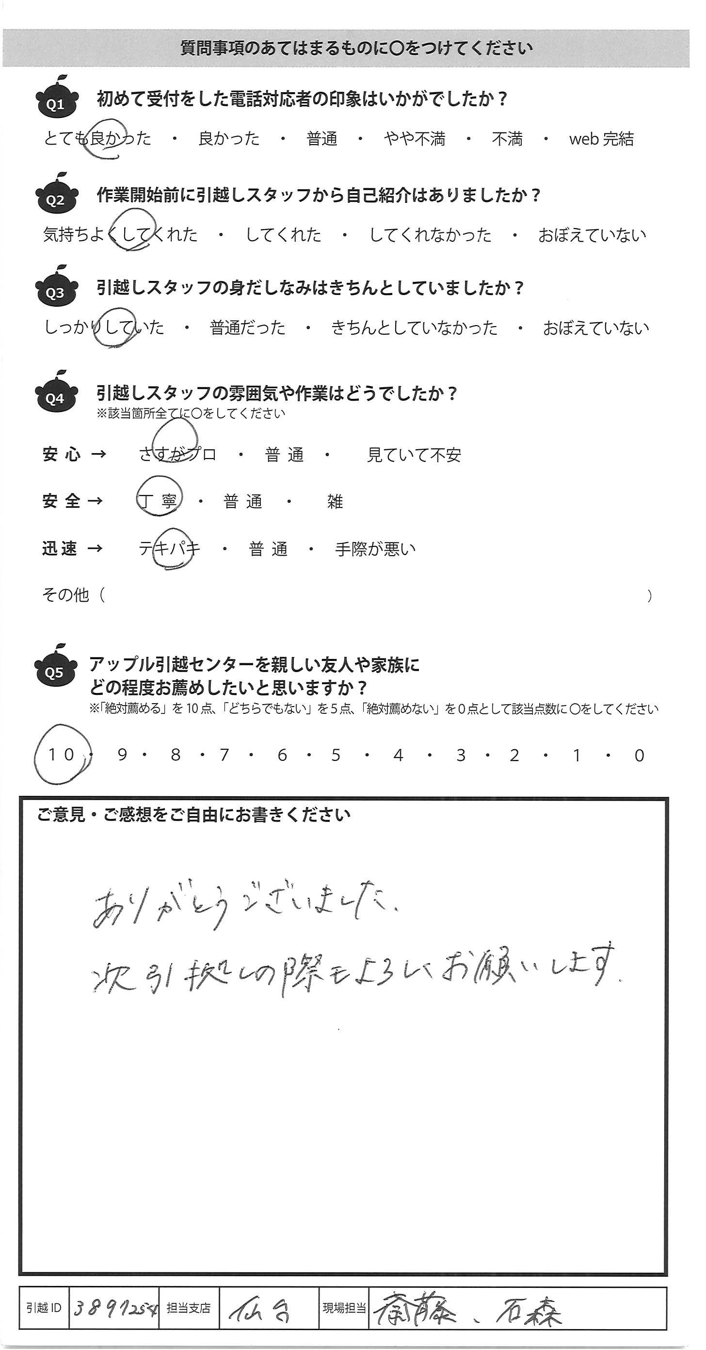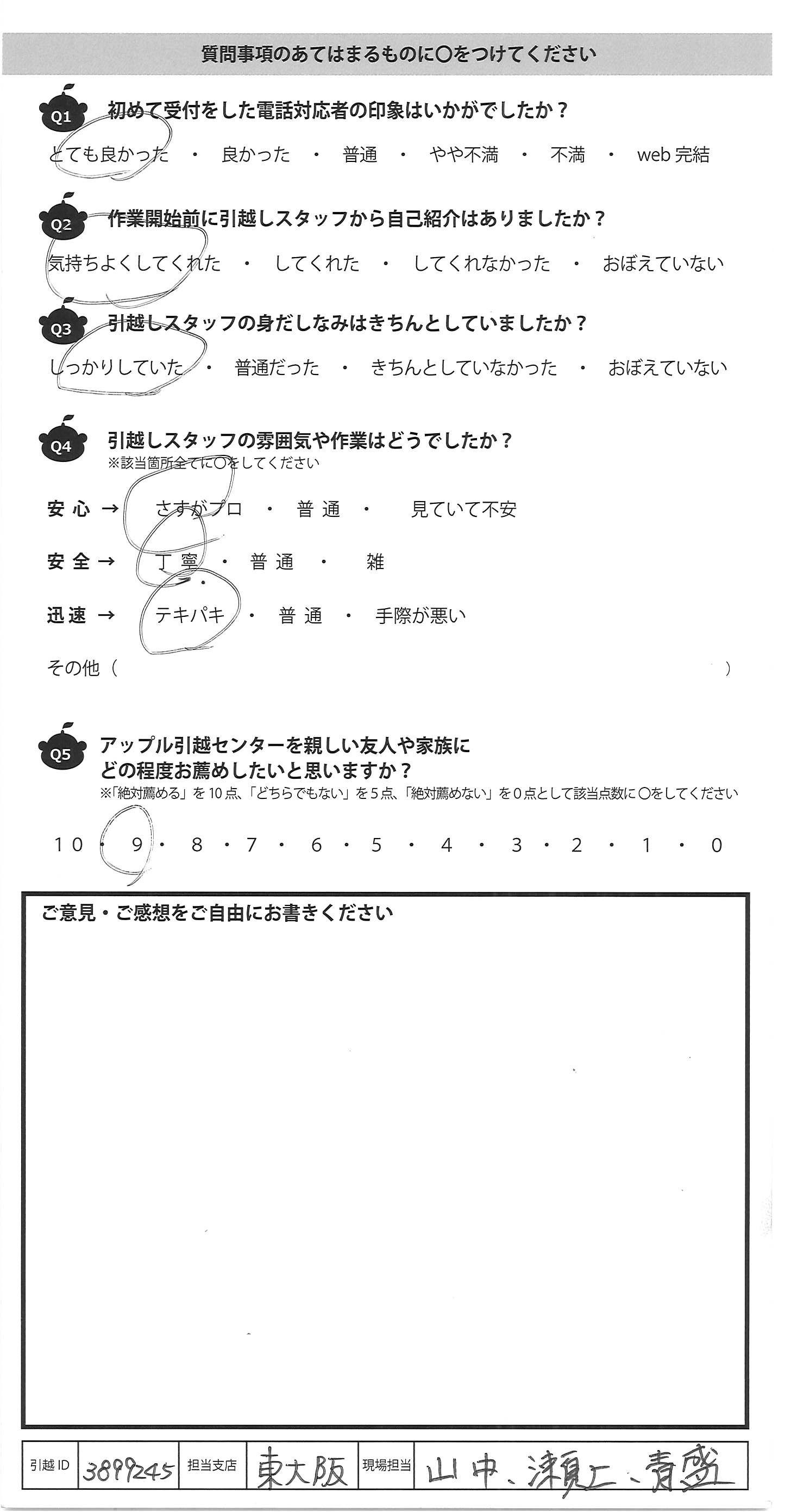 A.ごあいさつに来て頂いた最初から、ご丁寧でにこやかで 山内さんをはじめ、みなさん優しくテキパキ動いていただき、 本当に感謝いたします。 過去の引越で一番全ての面で最高でした。 是非、知り合いに紹介したいと思います。 山内さんによろしくお伝え下さい。 どうもありがとうございました。